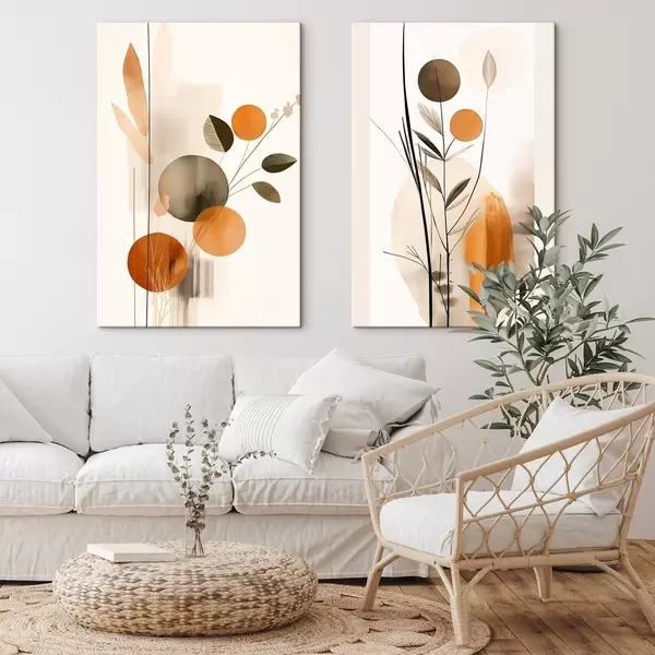 Wandbilder Abstrakte Malerei-Imitation mit orangefarbenen und grauen Kreisen, Blättern und Zweigen, moderner Stil, Aquarelleffekt Art. m01009