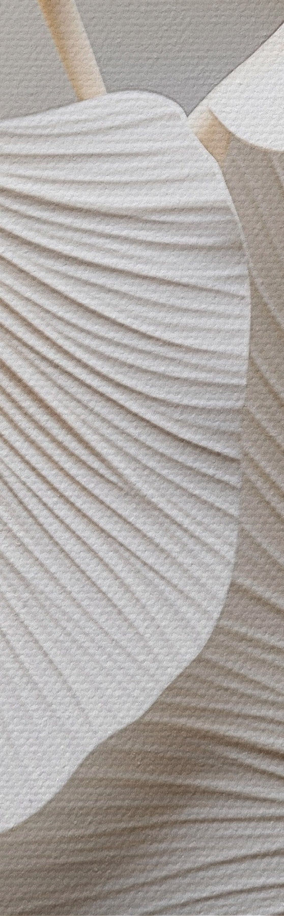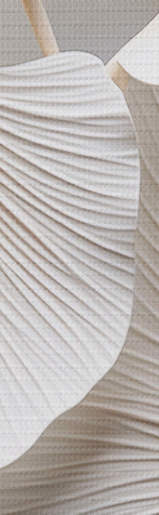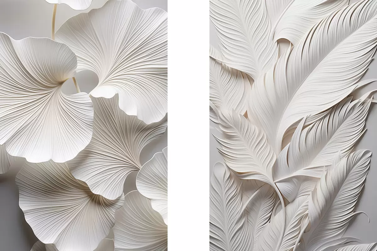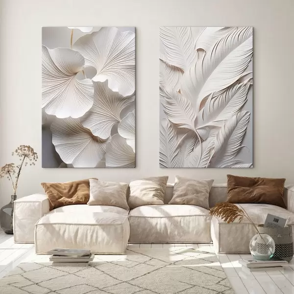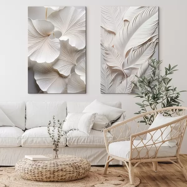 Wandbilder Weiße Ginkgoblätter und lange Blätter mit filigranen Details, die einen strukturierten und vielschichtigen Effekt erzeugen, minimalistische Kunst m01013