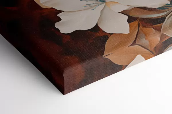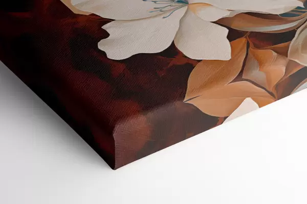 Wandbilder Abstrakte weiße Blumen und Blätter vor einem Hintergrund aus Braun und Blau mit abstrakten Formen, in minimalistischem Stil Art. m01015