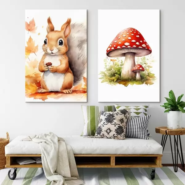 Wandbilder Eichhörnchen und Waldpilz, Fliegenpilz, Aquarellimitation Art. m01049