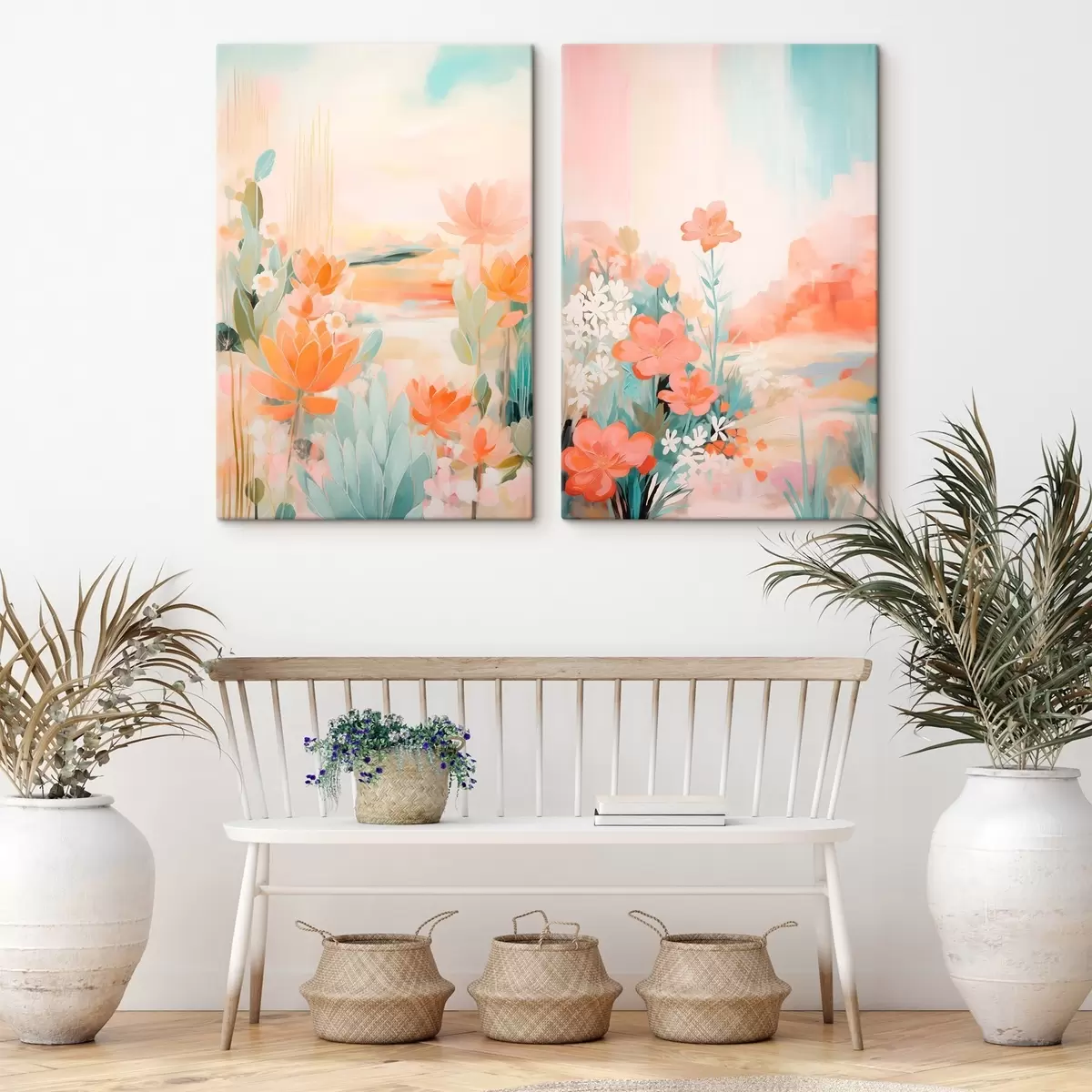 Wandbilder Blumenmotive in Pastelltönen vor dem Hintergrund eines leicht nebligen Tals Art. m01085