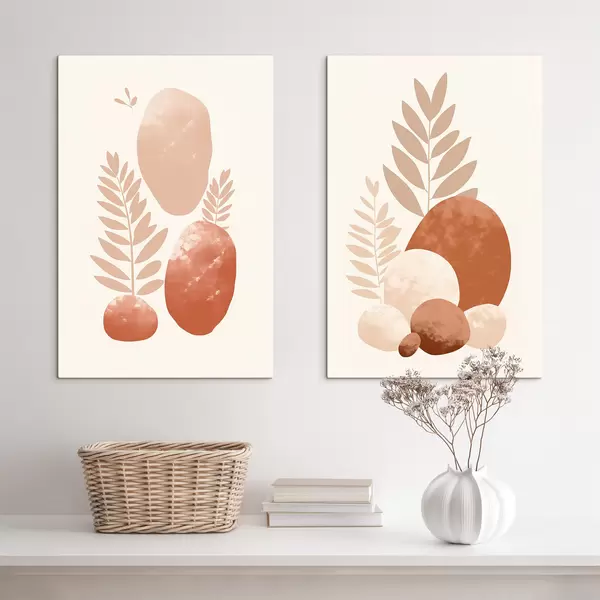 Wandbilder Abstrakte Formen, strukturierte Steine und Blätter in gedeckten Pfirsich- und Terrakottatönen, minimalistisch, cremefarbener Hintergrund Art. m01114