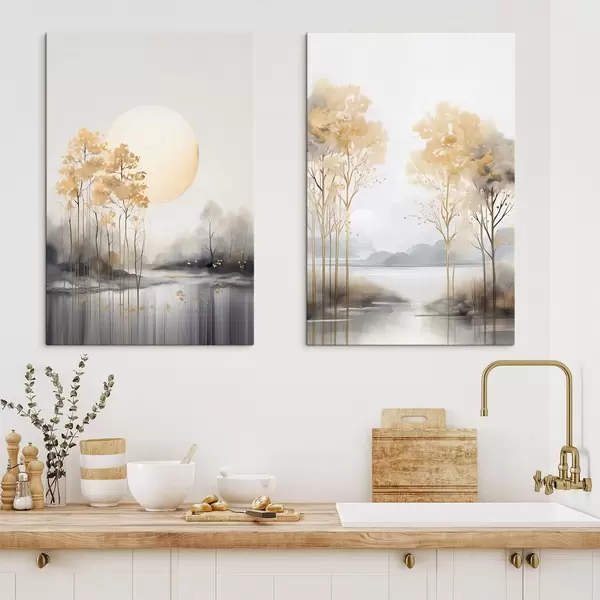 Wandbilder Dekorative abstrakte Landschaft, hohe Bäume mit gelben Blättern, ein Fluss und Nebel im Hintergrund Art. m01115