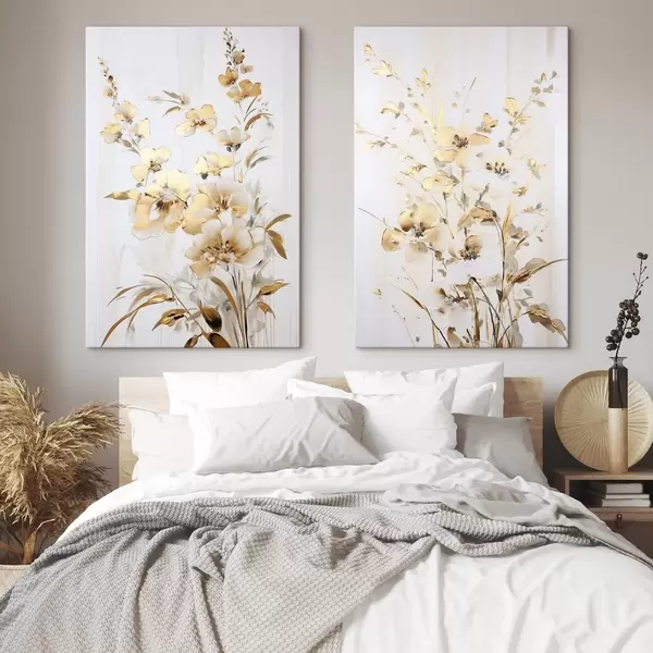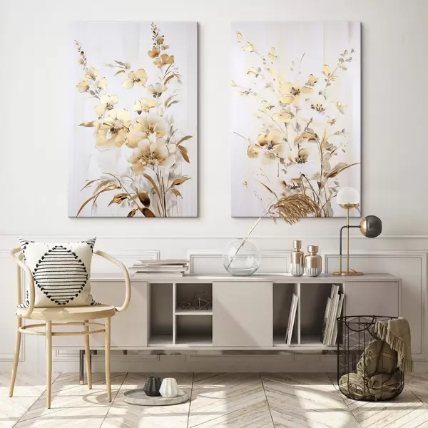 Wandbilder Strukturierte gelbe Blüten und Blätter vor weißem Hintergrund, mit zarten Pinselstrichen Art. m01116