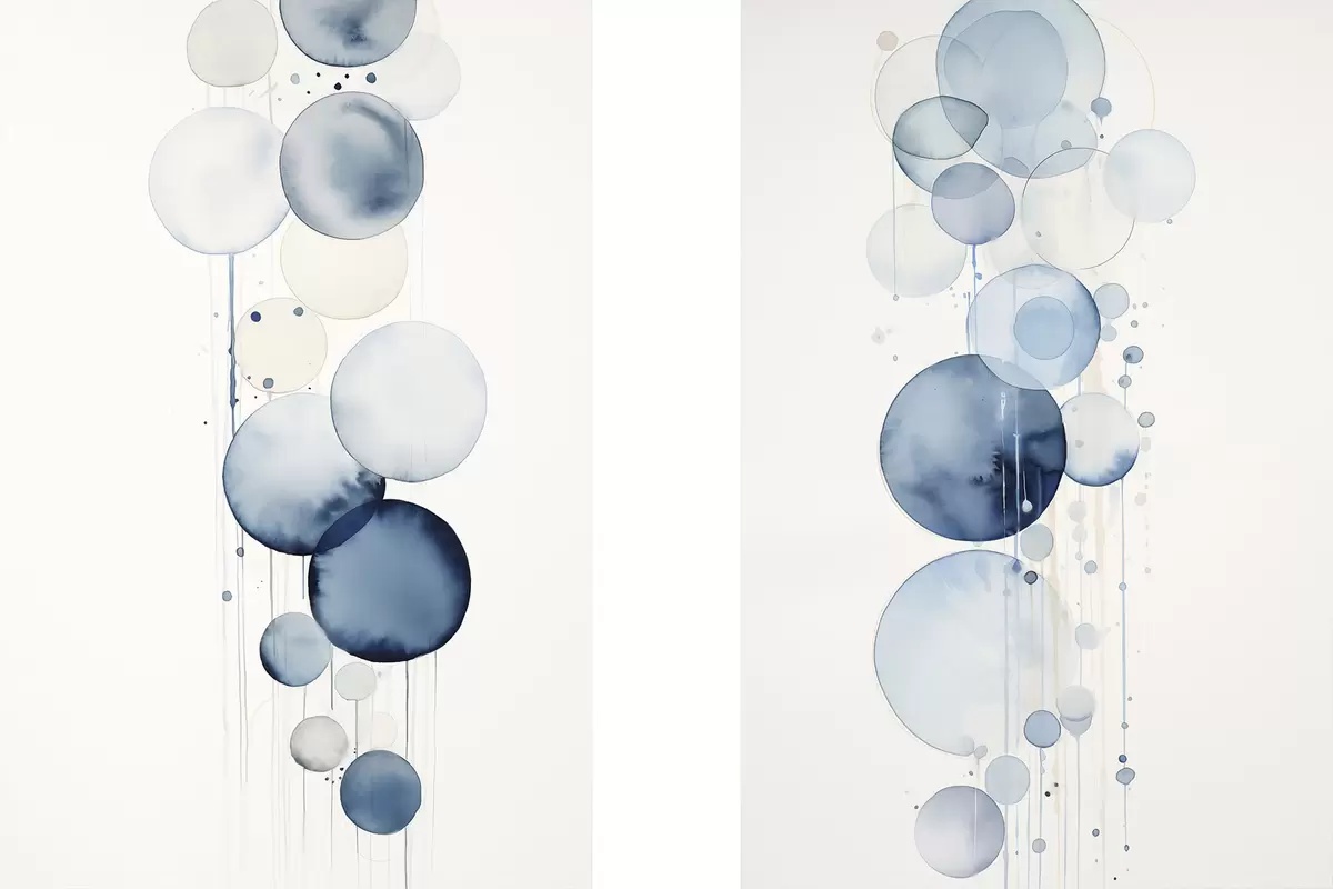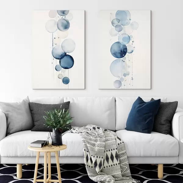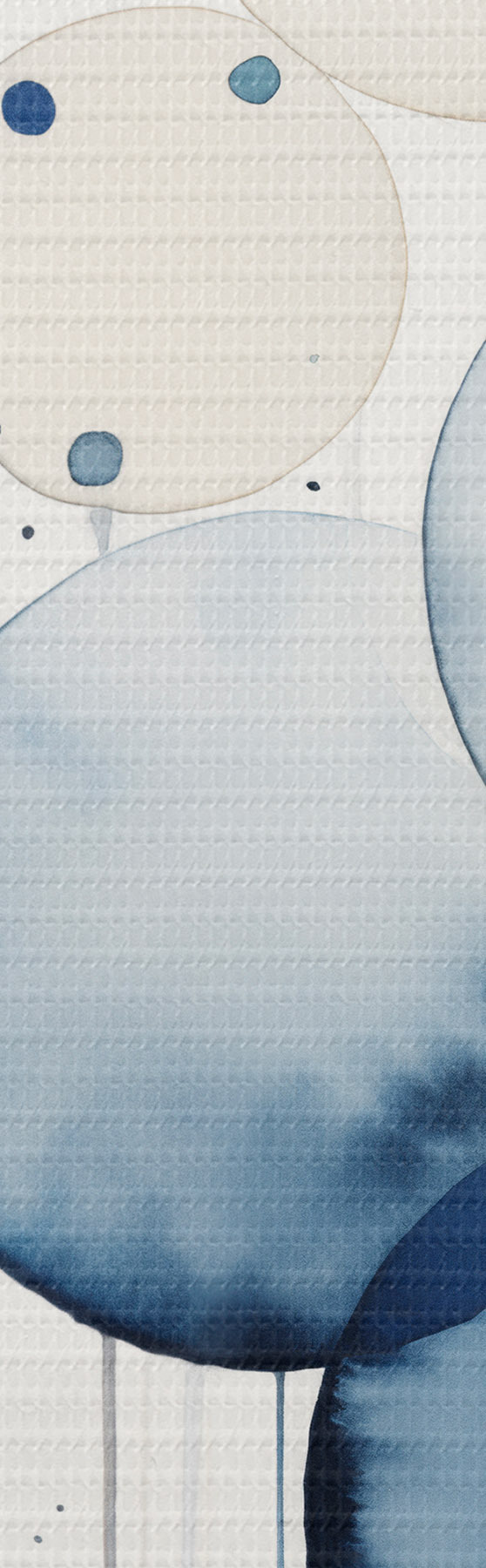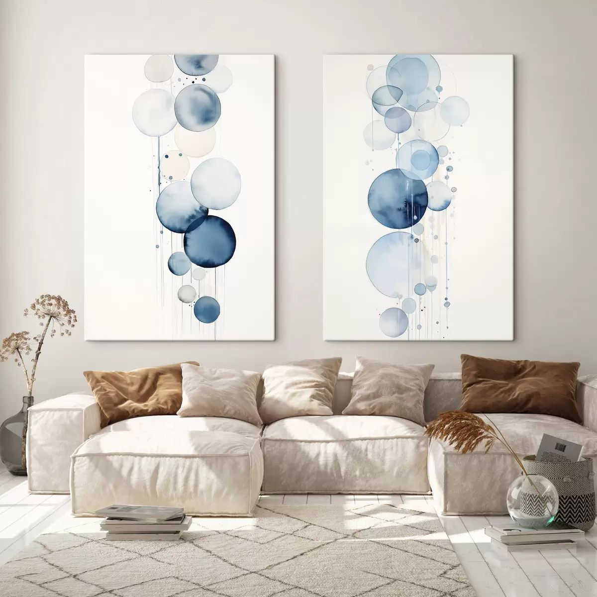 Wandbilder Abstrakte, strukturierte blaue und weiße Wasserfarbenkreise unterschiedlicher Größe vor weißem Hintergrund Art. m01118