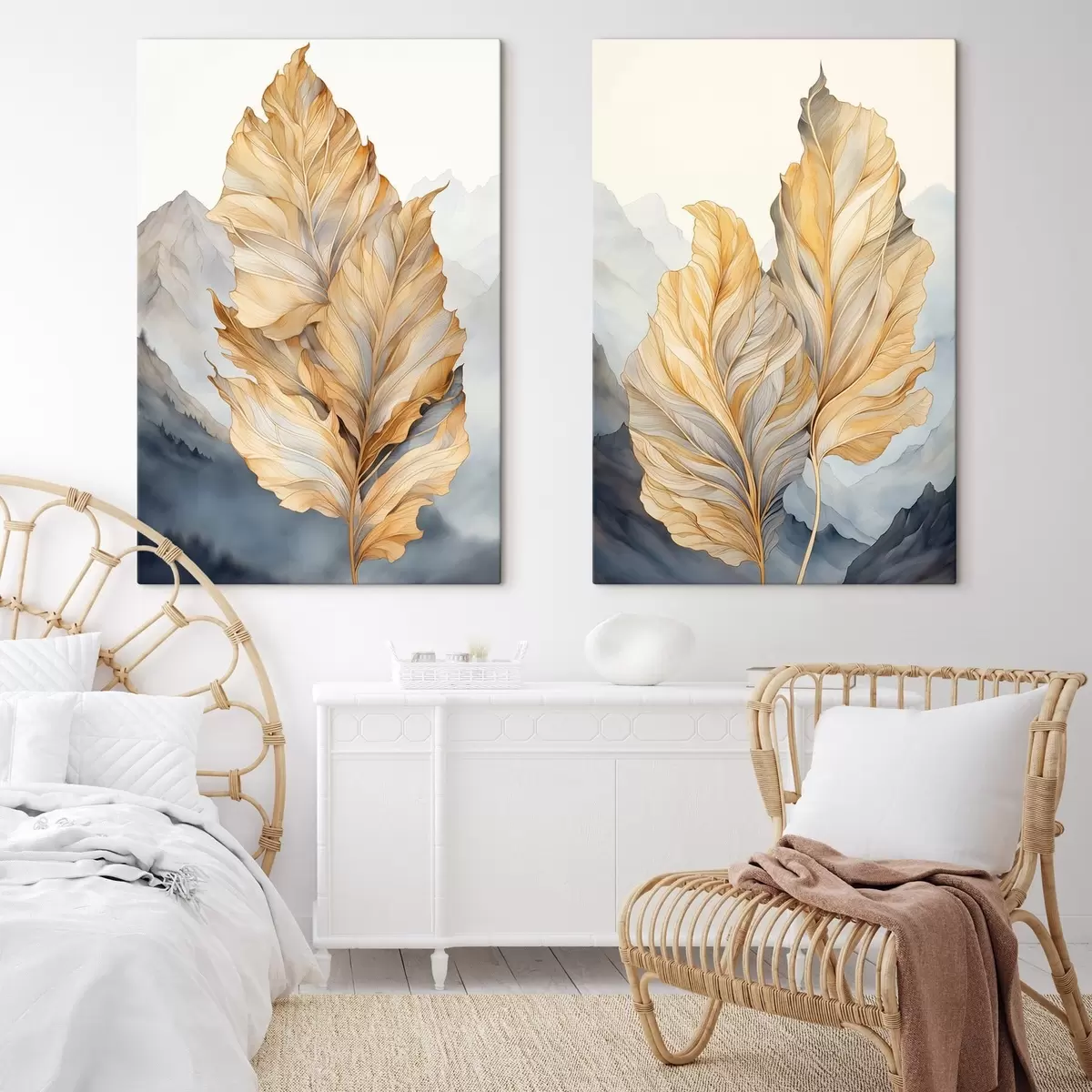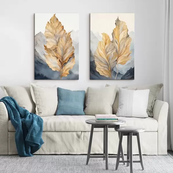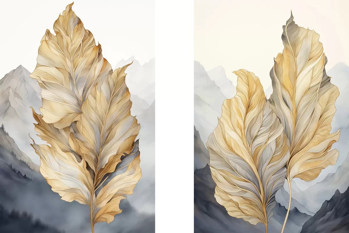 Wandbilder Abstrakte große, gelbe und braune Blätter mit komplexen Details vor einer Berglandschaft Art. m01119