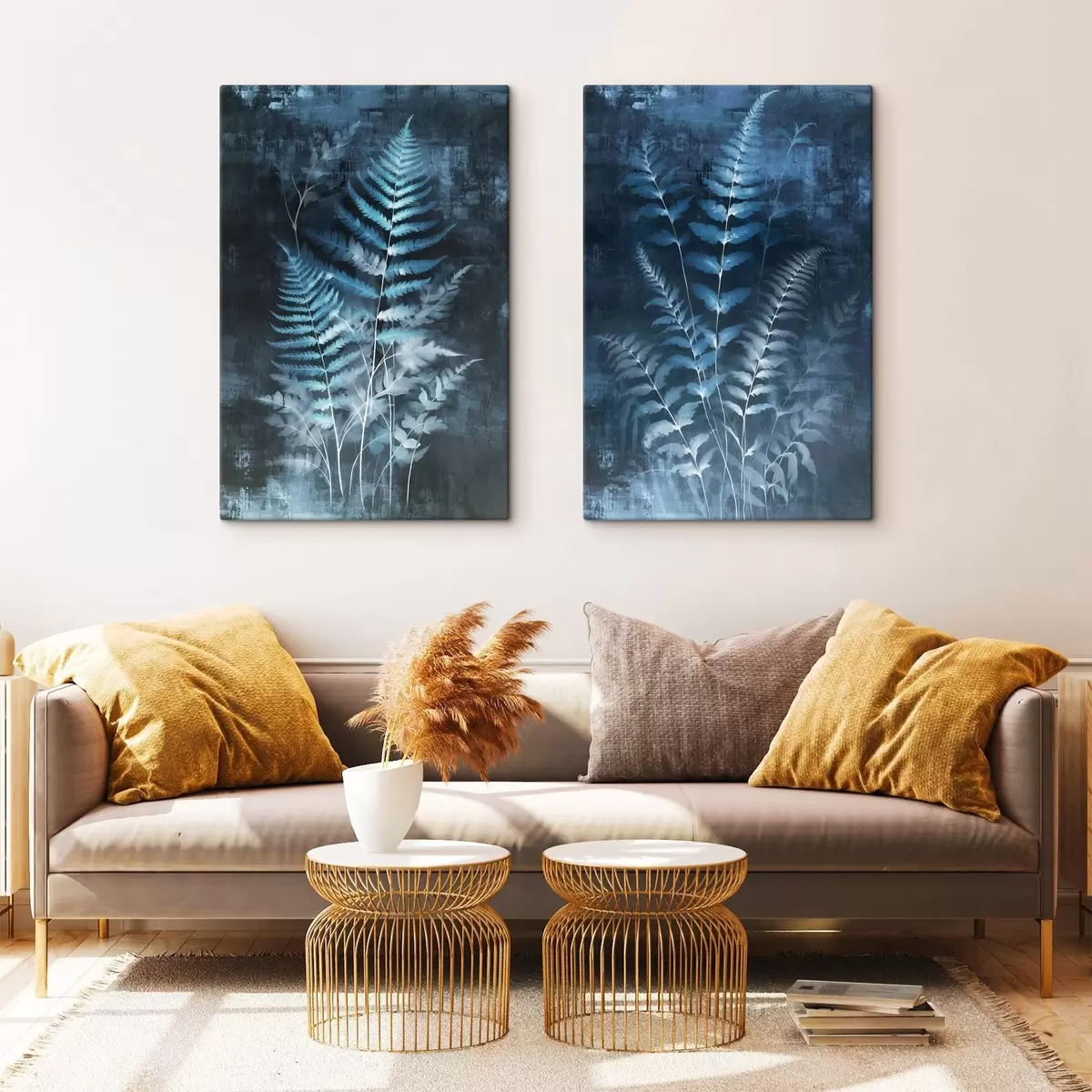 Wandbilder Blaue Farne und Pflanzen vor einem dunklen, strukturierten Hintergrund, mit Fokus auf den komplexen Details, Röntgeneffekt Art. m01121