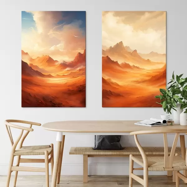 Wandbilder Eine weite, orangefarbene Wüstenlandschaft mit hoch aufragenden, felsigen Bergen unter einem dunstigen, sonnenbeschienenen Himmel mit dünnen Wolken. Art. m01122