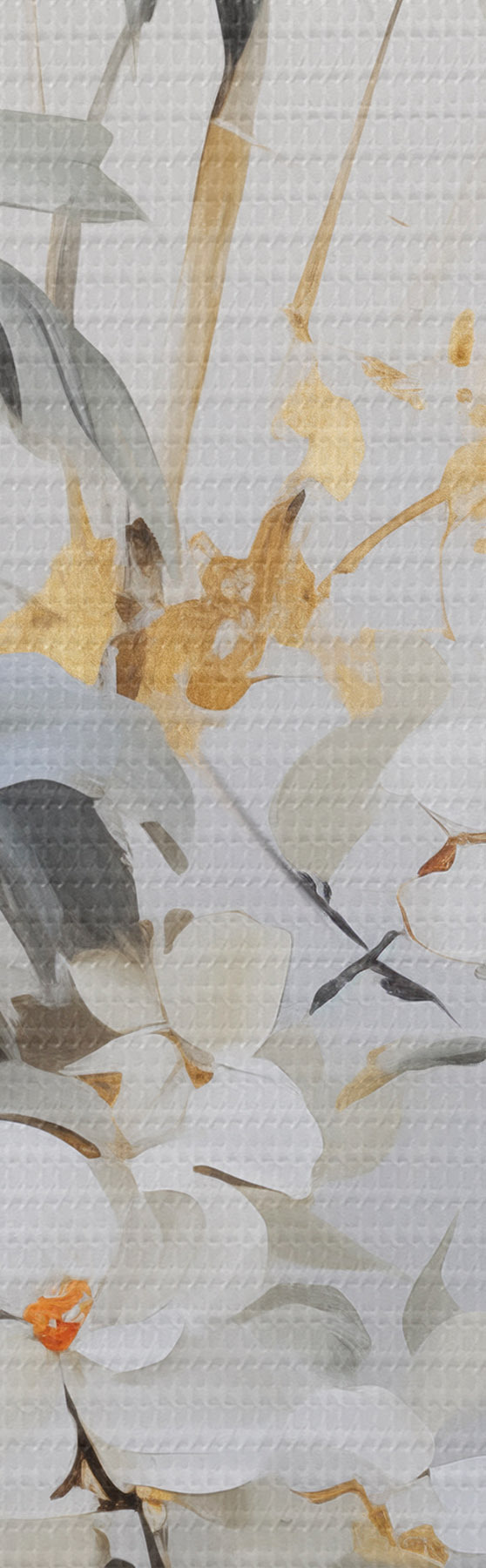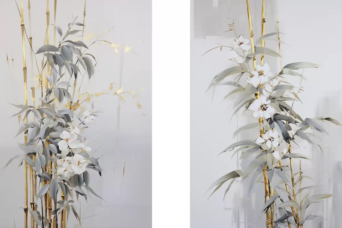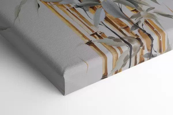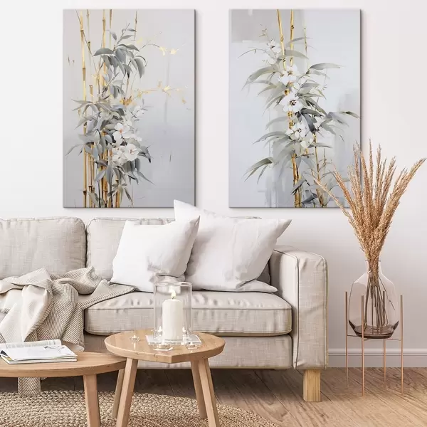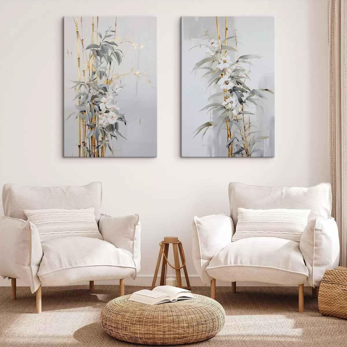 Wandbilder Abstrakte Bambusstämme mit gelben Akzenten, zarten weißen Blüten und hellgrünen Blättern, grauer Hintergrund Art. m01127