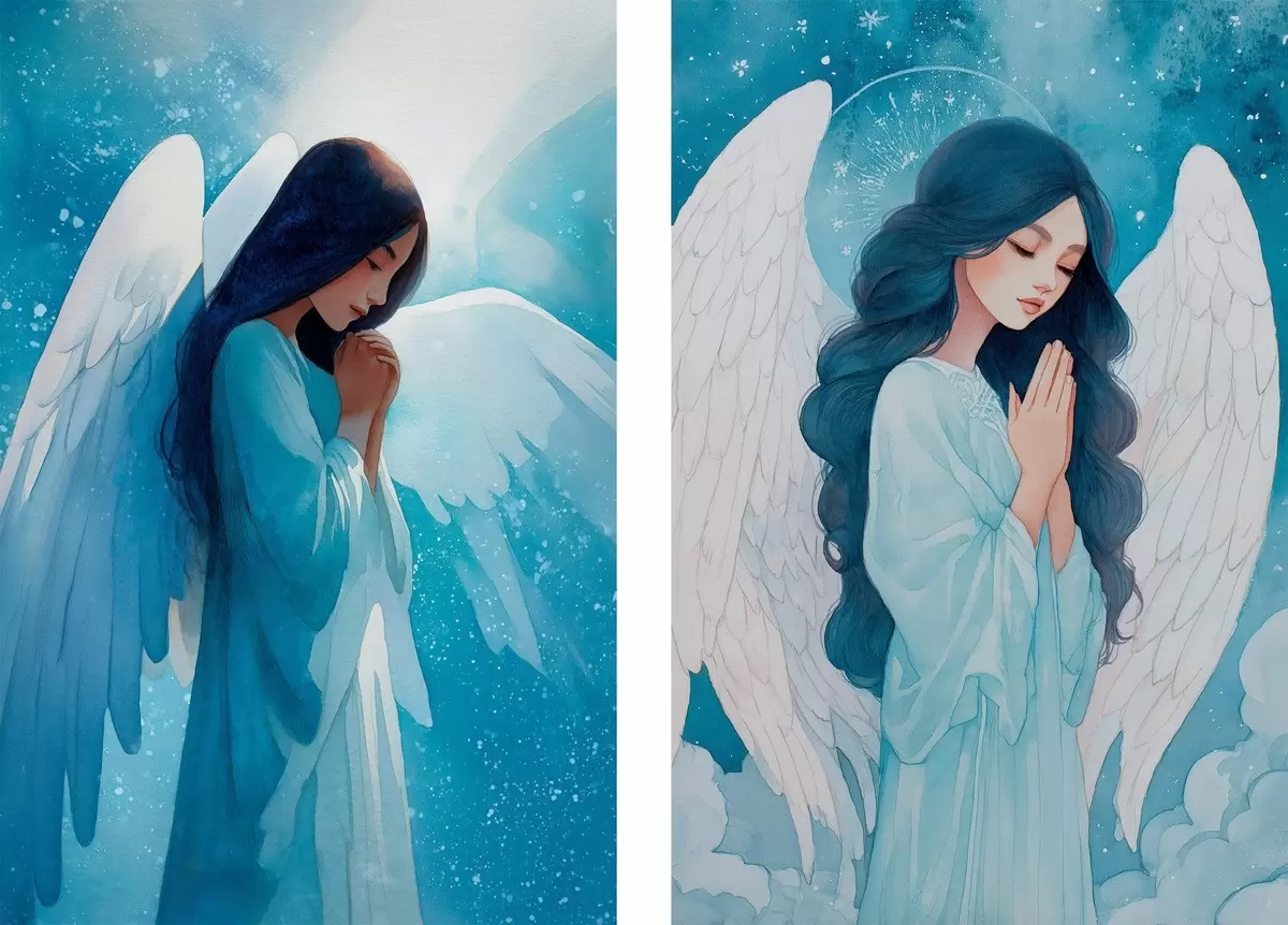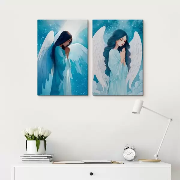 Wandbilder Moderne sakrale Kunst im Aquarellstil mit dem Bild eines Schutzengels in blauer Robe Art. m01153