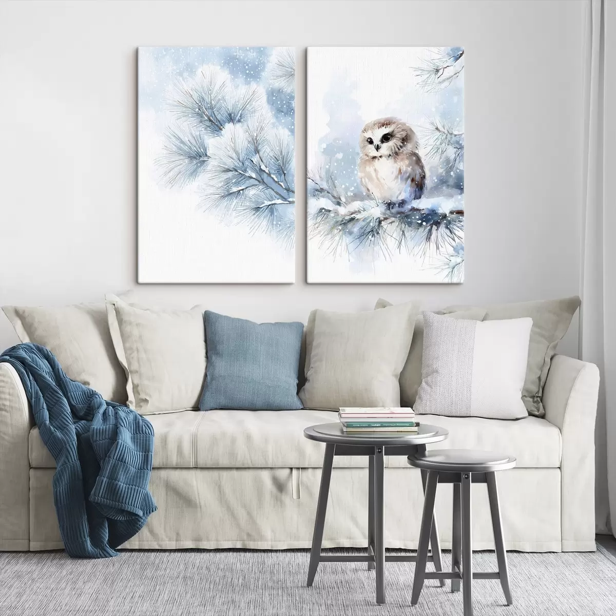 Wandbilder Niedliche Eule auf einem schneebedeckten Tannenzweig im Aquarellstil m01168