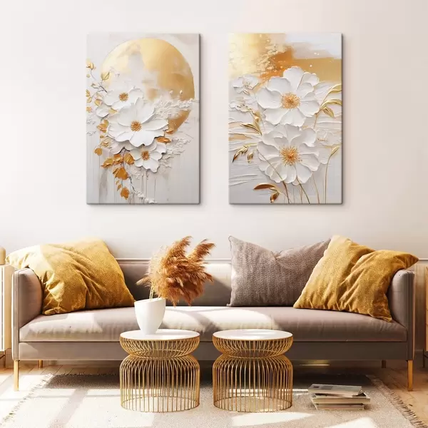 Wandbilder Weiße Blumen mit gelben Akzenten und zarten Blättern vor einem strukturierten Hintergrund, moderne Kunst m01233