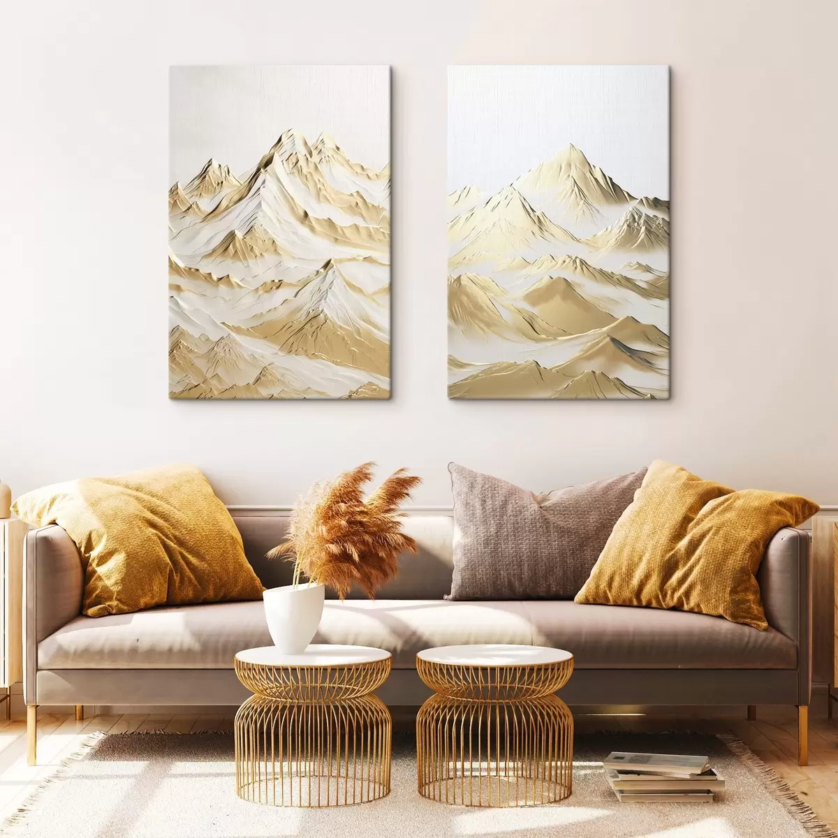 Wandbilder Eine Landschaft aus gelben, schneebedeckten Bergen mit scharfen Gipfeln und tiefen Tälern unter einem hellen Himmel Art. m01236