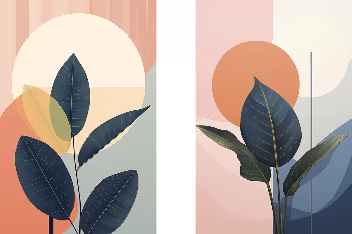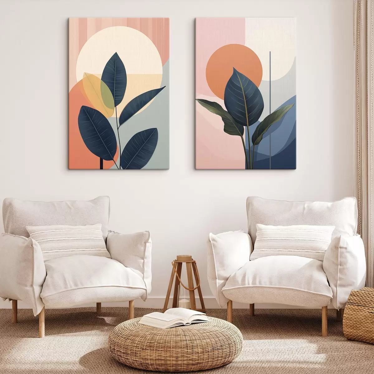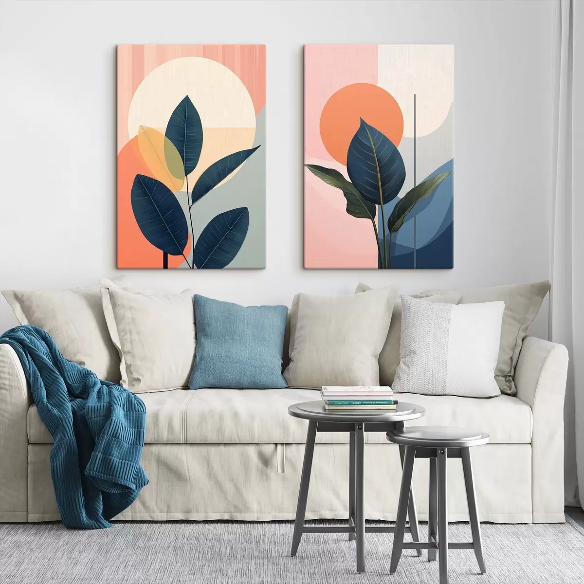 Wandbilder Dunkle Blätter vor einem Hintergrund aus abstrakten Formen in Pfirsich und Grau mit einem großen, hellgelben Kreis Art. m01238