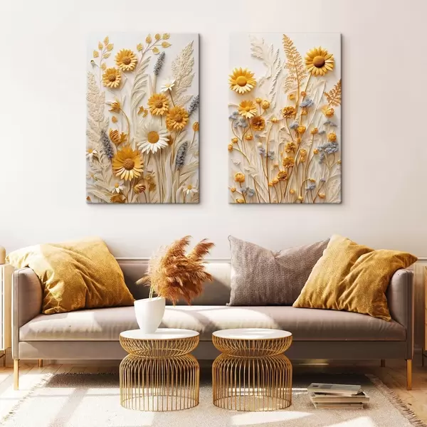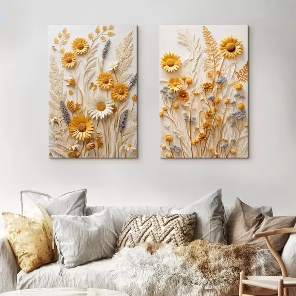 Wandbilder Eine strukturierte Kollektion aus gelben und weißen Gänseblümchen mit getrockneten Gräsern und Lavendelzweigen auf weißem Hintergrund. Art. m01241