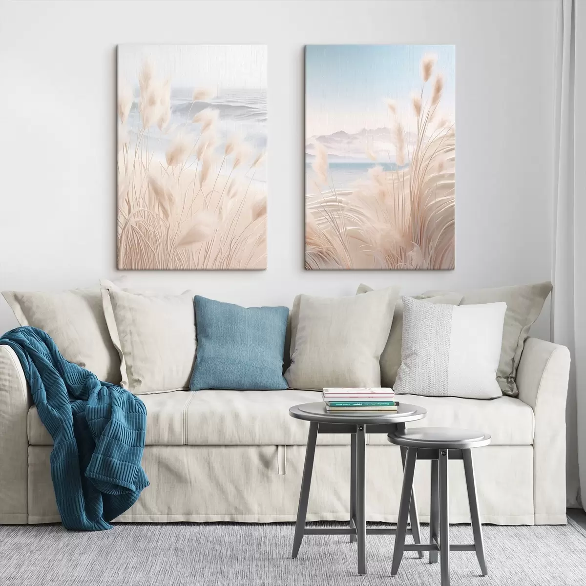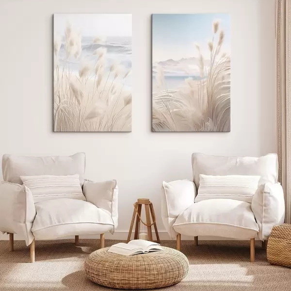 Wandbilder Hohes, federartiges Pampasgras in sanften Beigetönen im Vordergrund, mit einem Sandstrand im Hintergrund Art. m01242