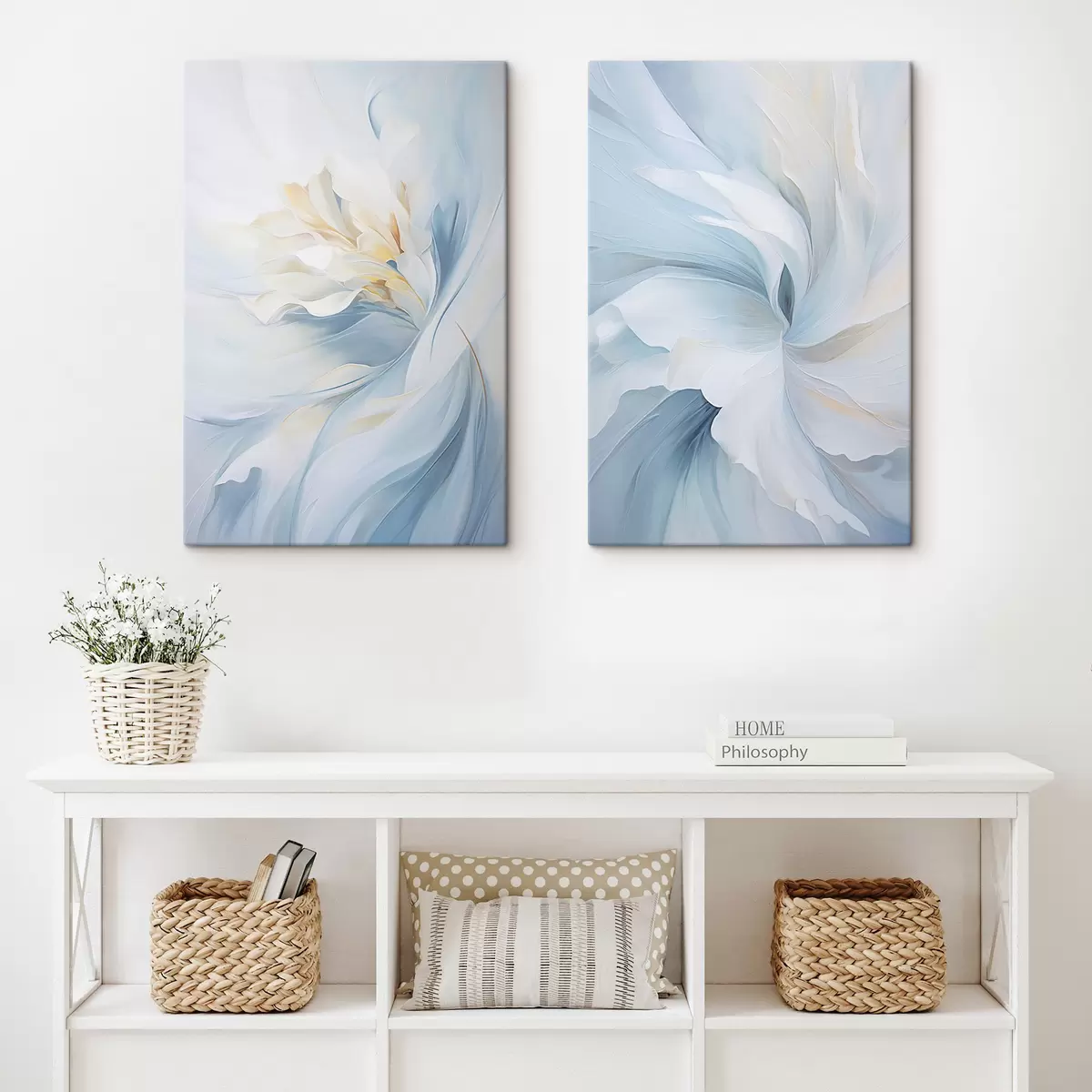 Wandbilder Abstrakte, zarte, durchscheinende Blütenblätter, die sich bei sanfter Beleuchtung und einer malerischen Textur nach innen drehen. Art. m01244