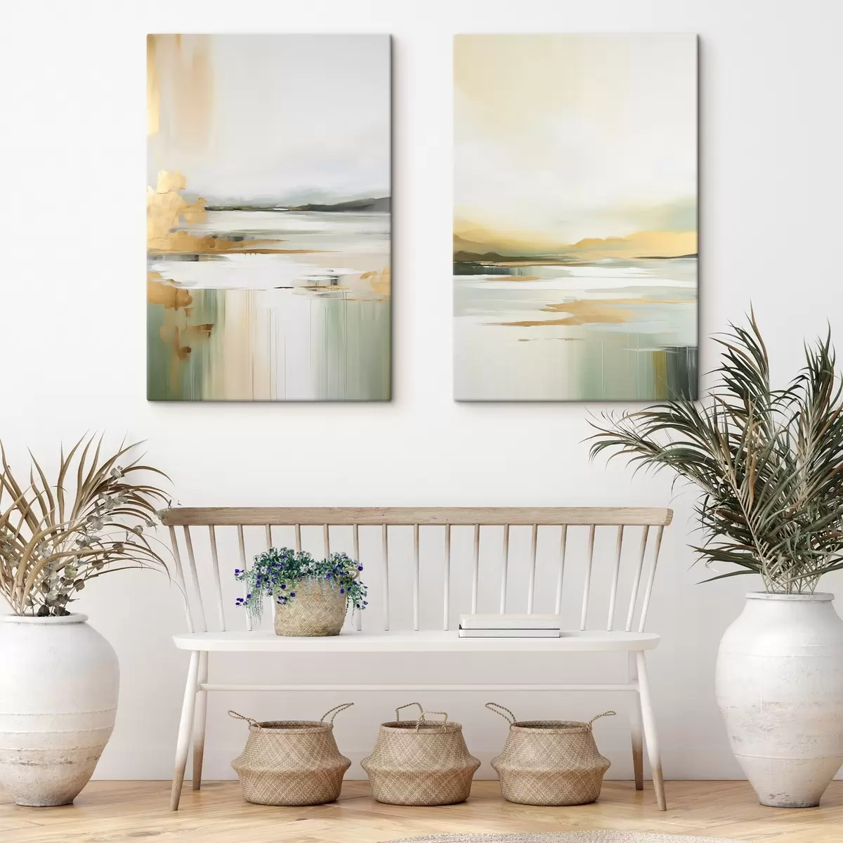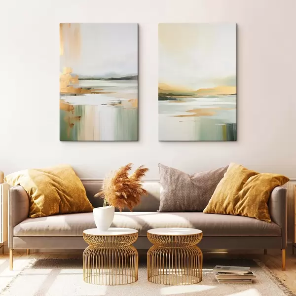 Wandbilder Abstrakte Landschaft mit Gelb- und Grüntönen, Wasser, das den Himmel und entfernte Berge reflektiert, blasser, dunstiger Himmel Art. m01245