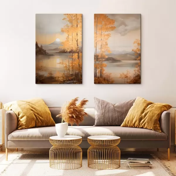 Wandbilder Herbstliche Bäume mit orangefarbenen Blättern umrahmen einen ruhigen See mit fernen Bergen unter einem bewölkten Himmel. Art. m01246