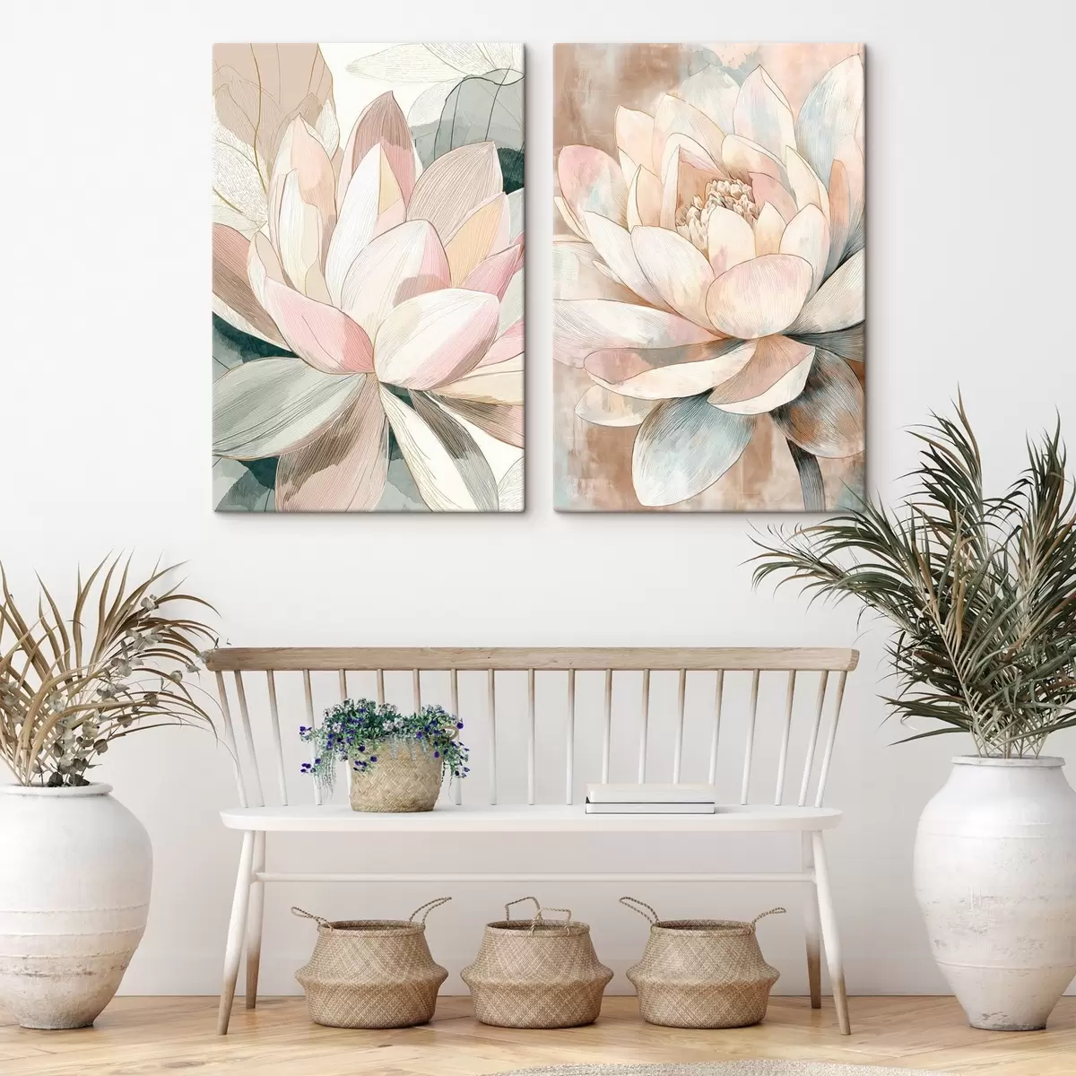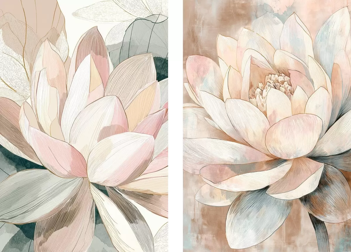 Wandbilder Blumenarrangement mit großen Lotusblumen in Pastell-Korallenfarben m30034
