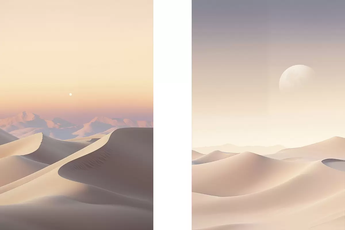 Wandbilder Eine Wüstenlandschaft mit sanften Sanddünen unter einem zarten Pastellhimmel, im Hintergrund entfernte Berge. m30053