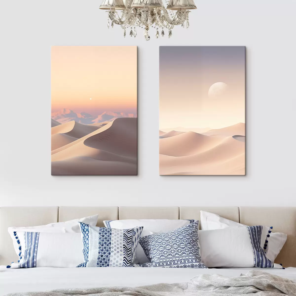 Wandbilder Eine Wüstenlandschaft mit sanften Sanddünen unter einem zarten Pastellhimmel, im Hintergrund entfernte Berge. Art. m30053