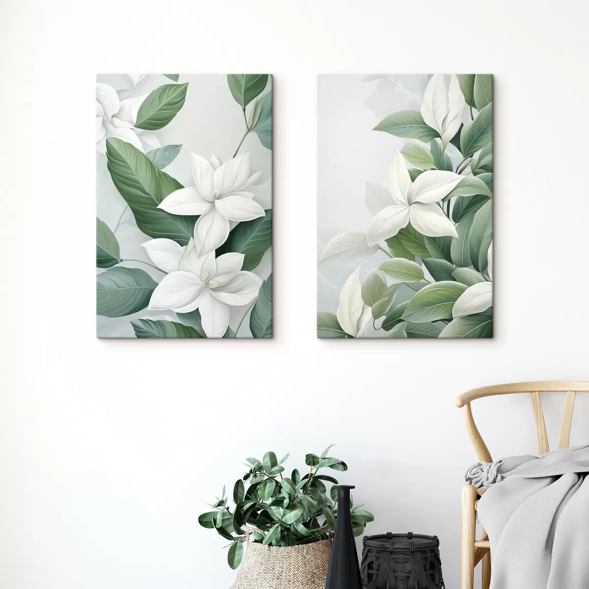 Wandbilder Weiße Blumen mit grünen Blättern, pastellfarbener Hintergrund Art. m30055
