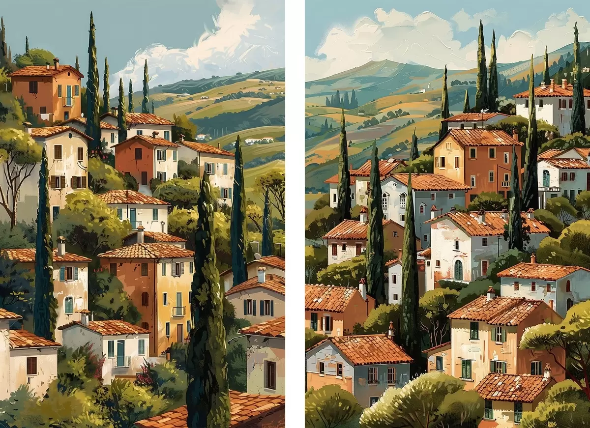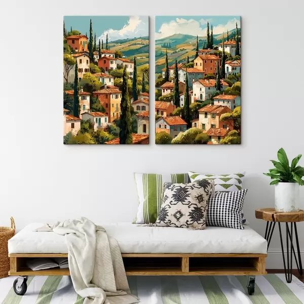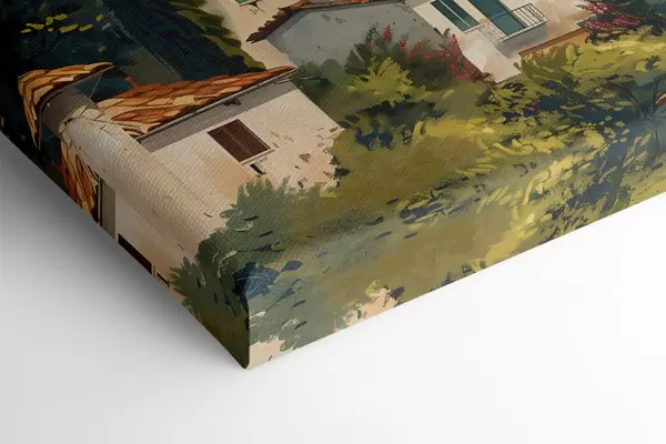 Wandbilder Mediterranes Bergdorf, übereinanderliegende Häuser in warmen Farbtönen mit Terrakottadächern m30097