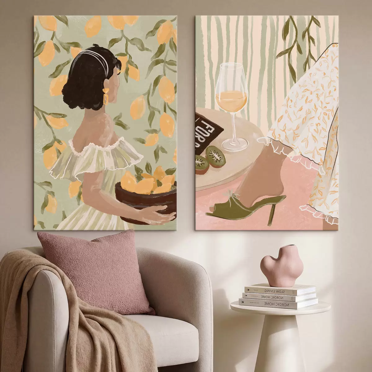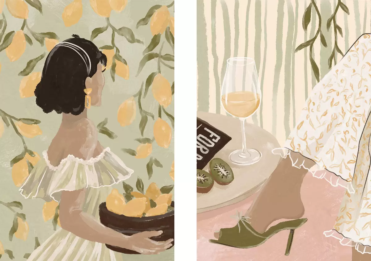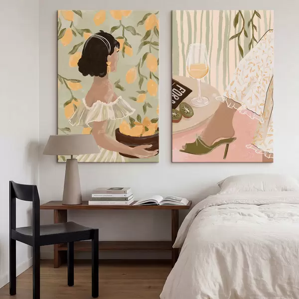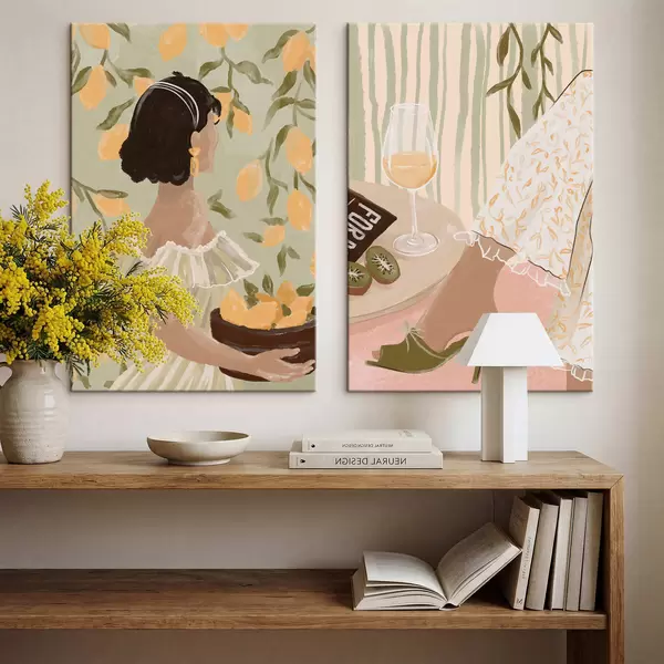Wandbilder Frau mit Zitronen und Tisch mit Glas Art. m30104