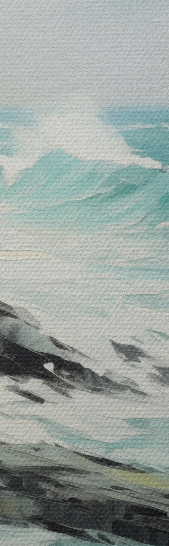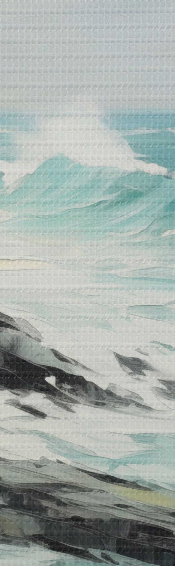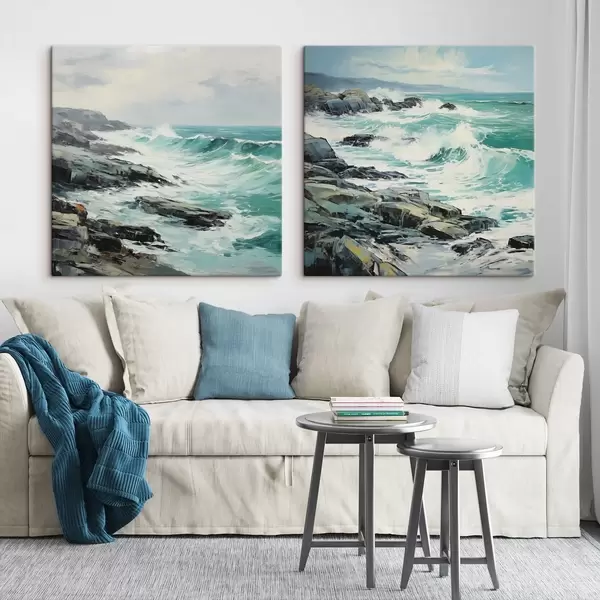Wandbilder Eine felsige Küstenlandschaft mit Wellen unter bewölktem Himmel, im Stil eines Gemäldes Art. m30198