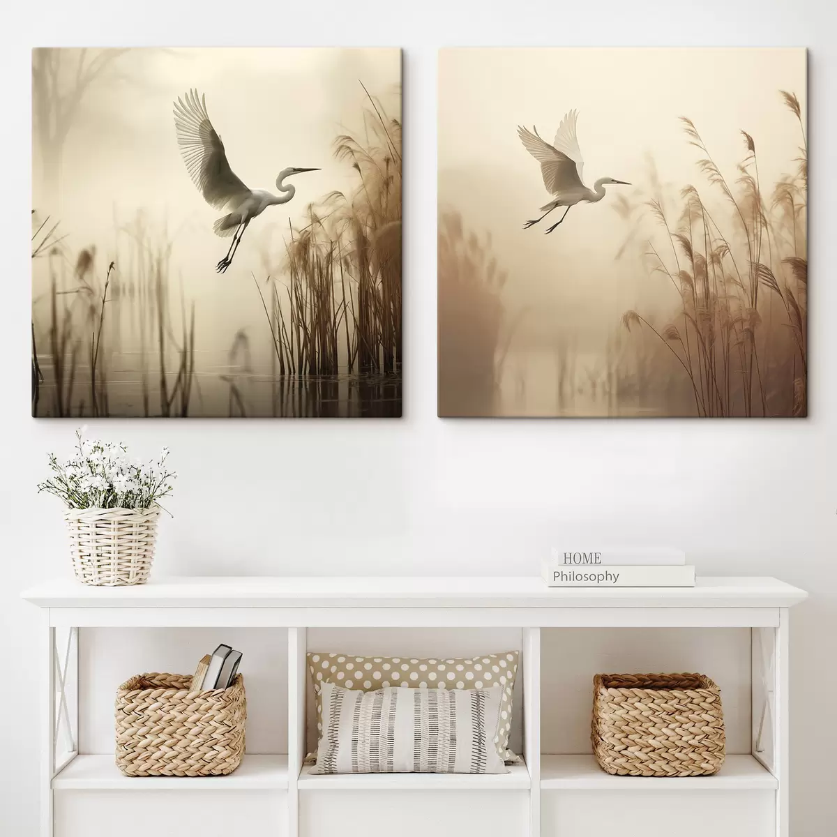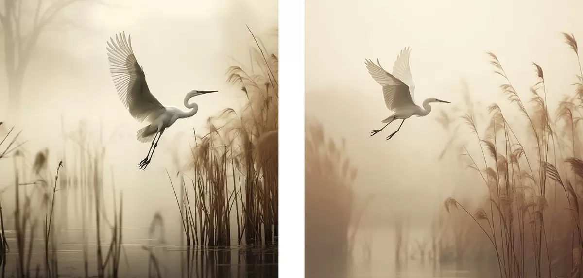 Wandbilder Ein Silberreiher fliegt über einen See, umgeben von hohem Schilf und Bäumen im Hintergrund Art. m30199