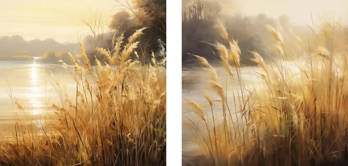 Wandbilder Im Vordergrund hohes, trockenes Gras mit Ährchen, im Hintergrund ein See und Bäume Art. m30201