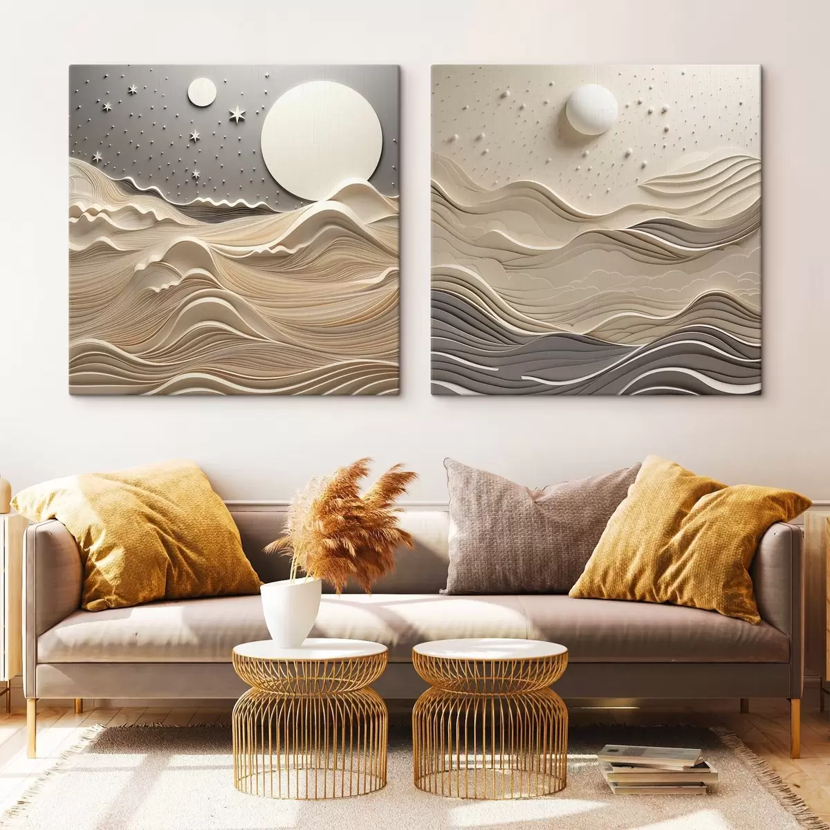 Wandbilder Eine minimalistisch stilisierte Landschaft mit sanften Hügeln und einem großen Mond am Sternenhimmel, abstrakte Kunst Art. m30205