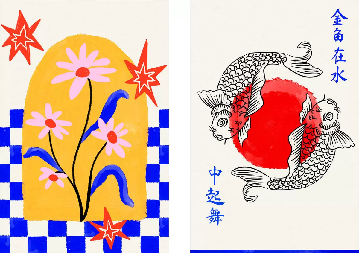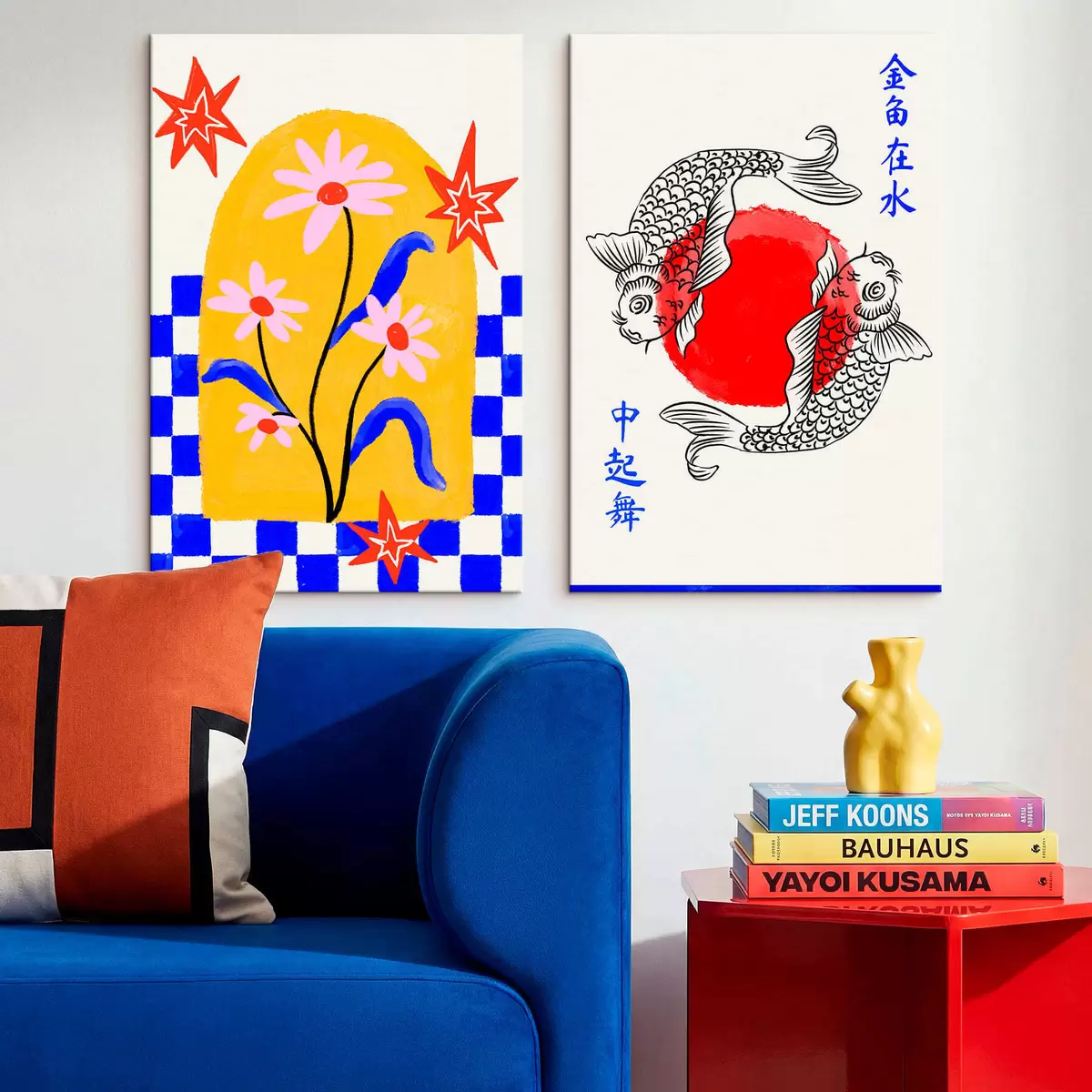 Wandbilder Zweiteiliges Bild mit einer Katze und zwei Fischen in Rot- und Weißtönen Art. m30235