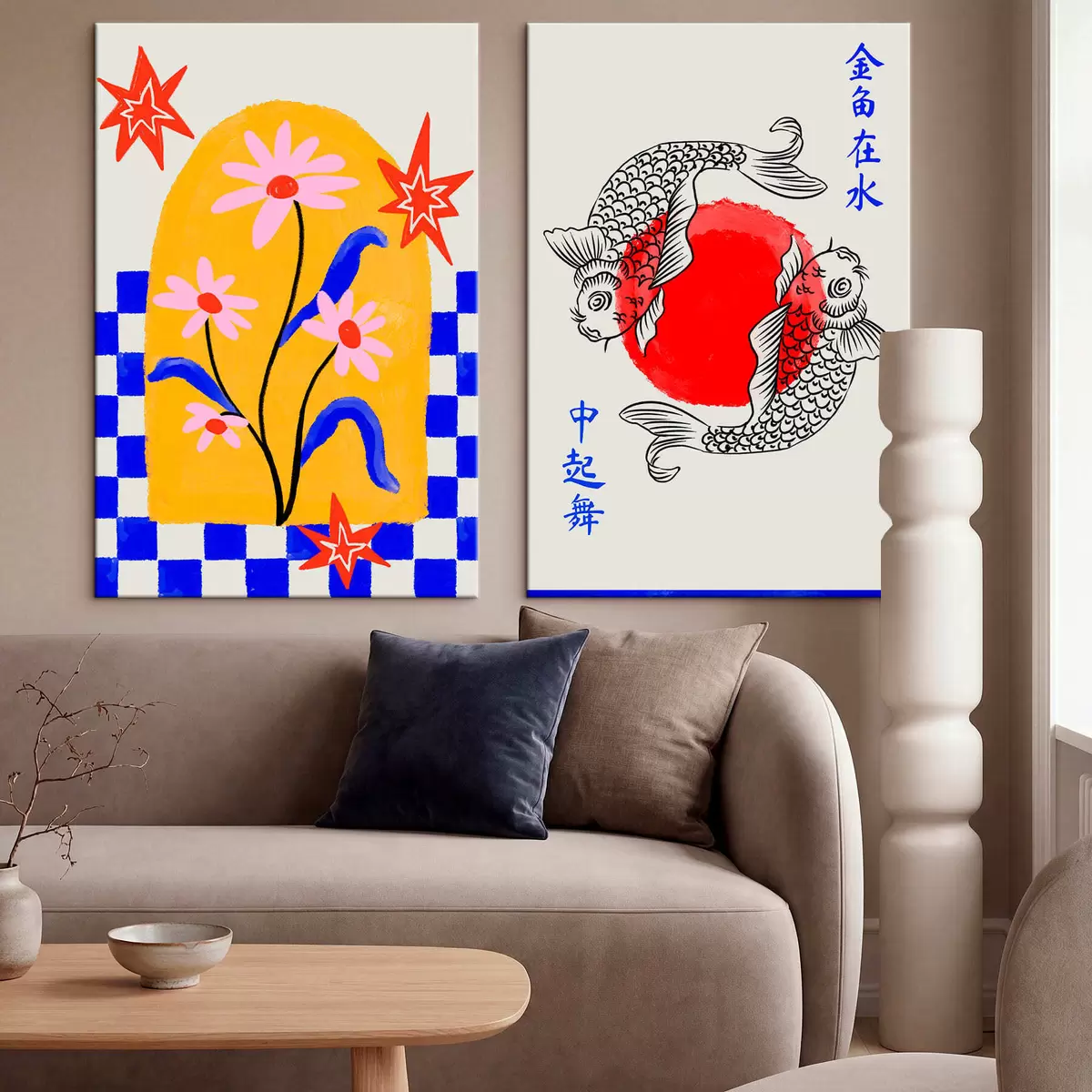 Wandbilder Zweiteiliges Bild mit einer Katze und zwei Fischen in Rot- und Weißtönen m30235