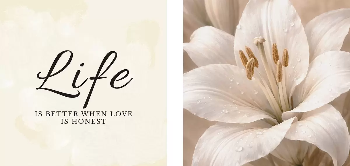Wandbilder Diptychon mit „Life“-Schriftzug und Nahaufnahme einer weißen Blume m30237