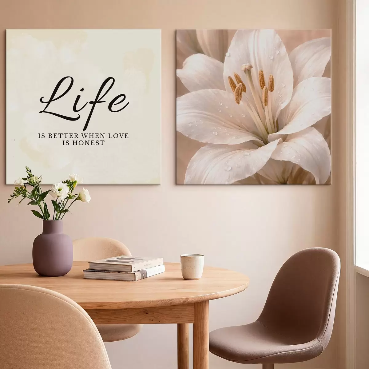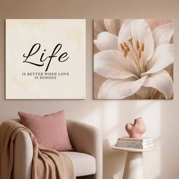 Wandbilder Diptychon mit „Life“-Schriftzug und Nahaufnahme einer weißen Blume Art. m30237