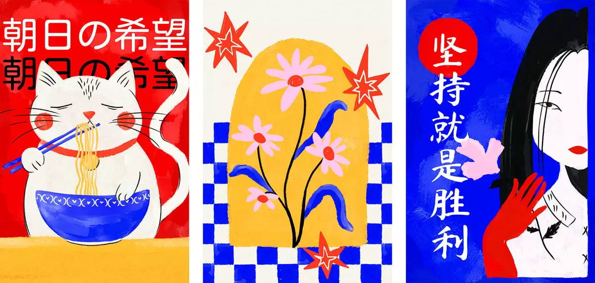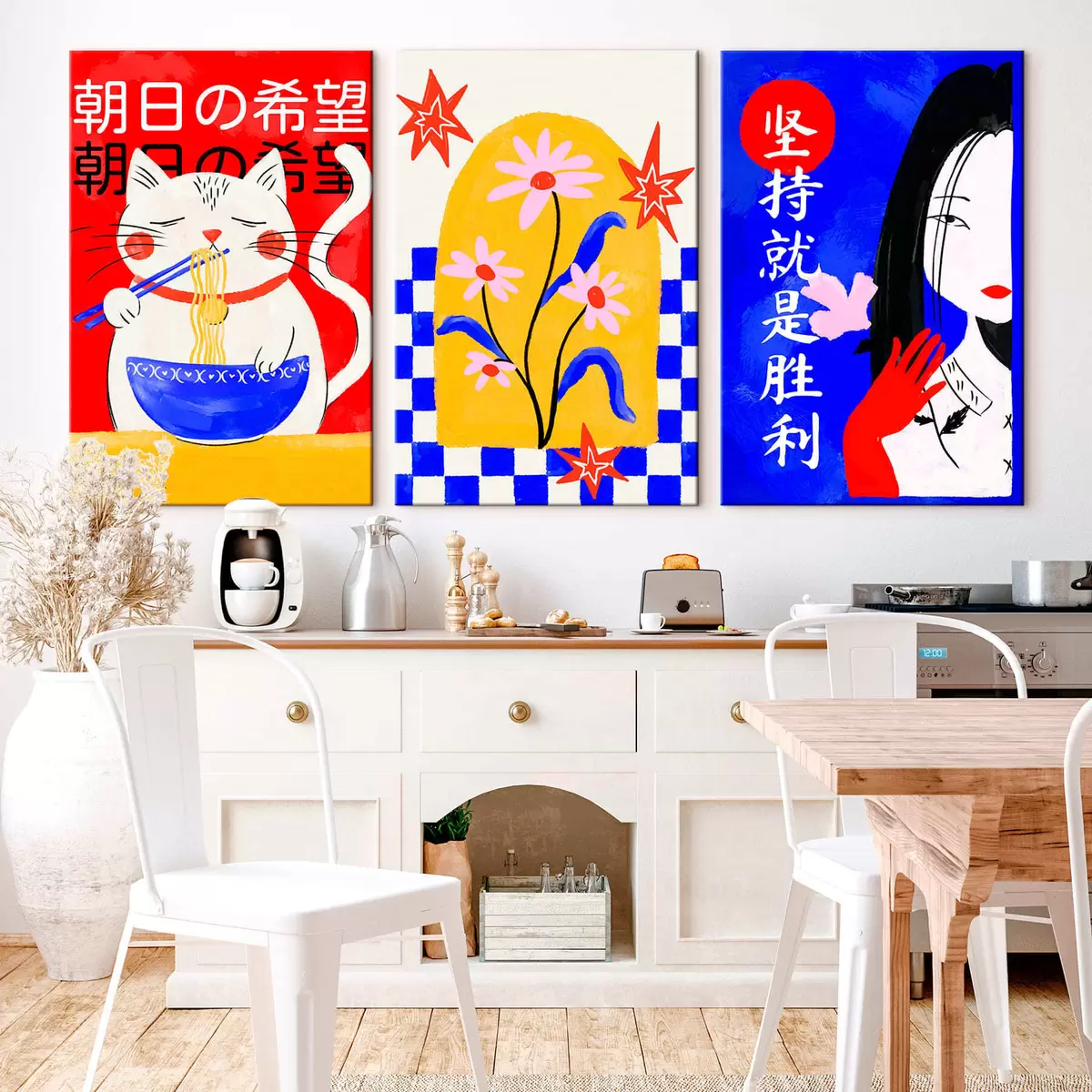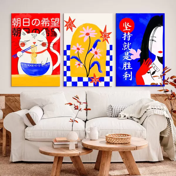Wandbilder Dreiteiliges Bild mit Katze, Fisch und Frauenporträt Art. m30240