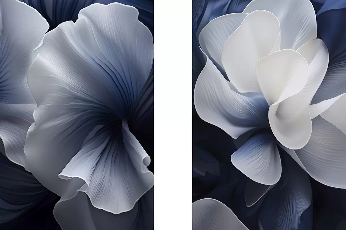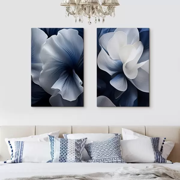 Wandbilder Abstrakte blau-weiße Blütenblätter vor dunklem Hintergrund Art. m30316