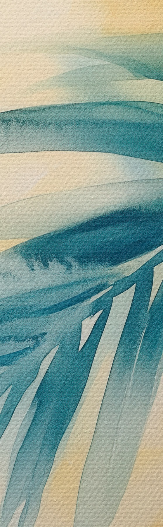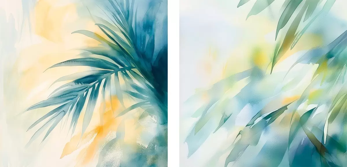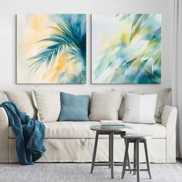 Wandbilder Tropische Blätter in einer türkis-gelben Farbpalette im Aquarellstil m30351