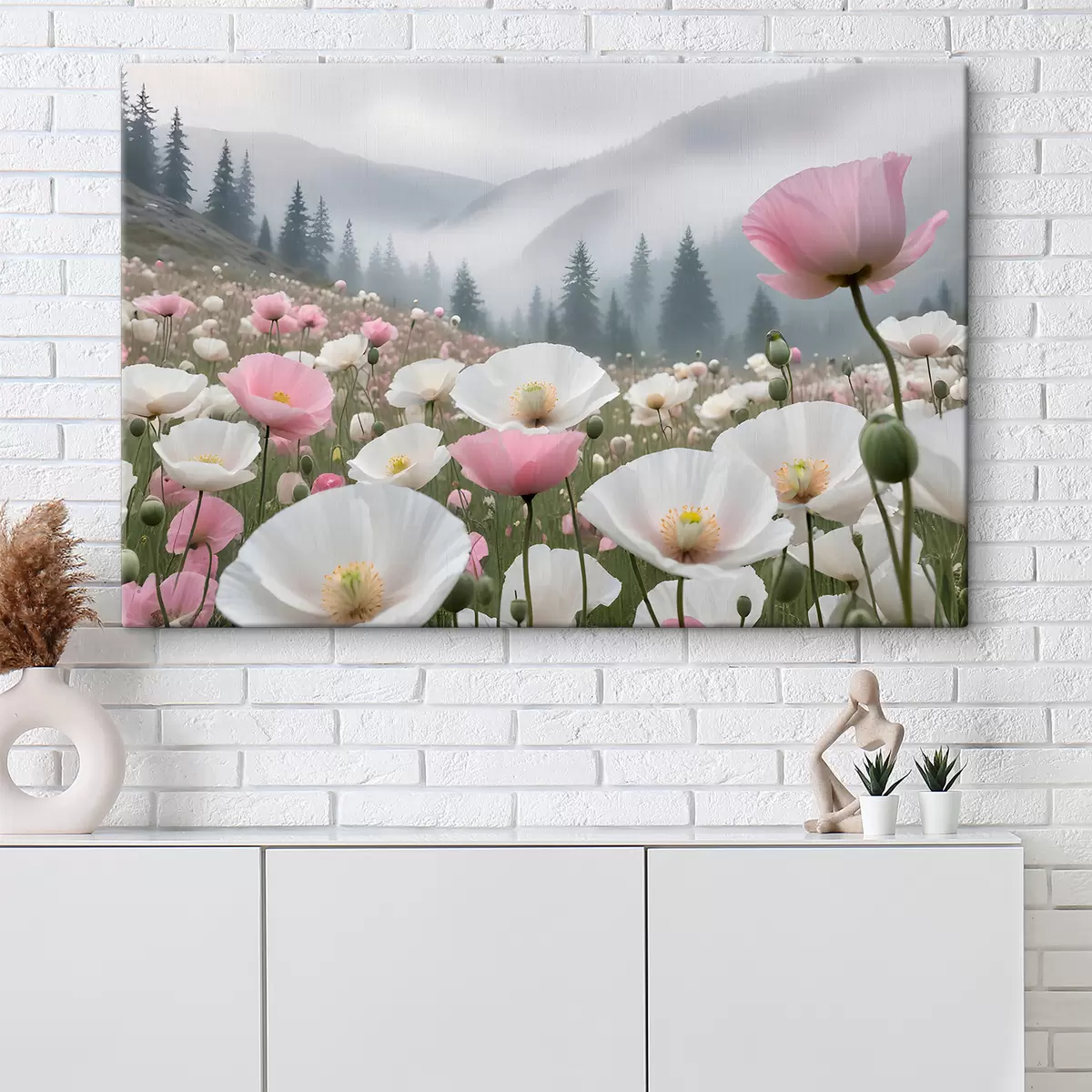 Wandbilder Ein Feld mit rosa und weißen Mohnblumen in der Berglandschaft im Hintergrund Art. s38369