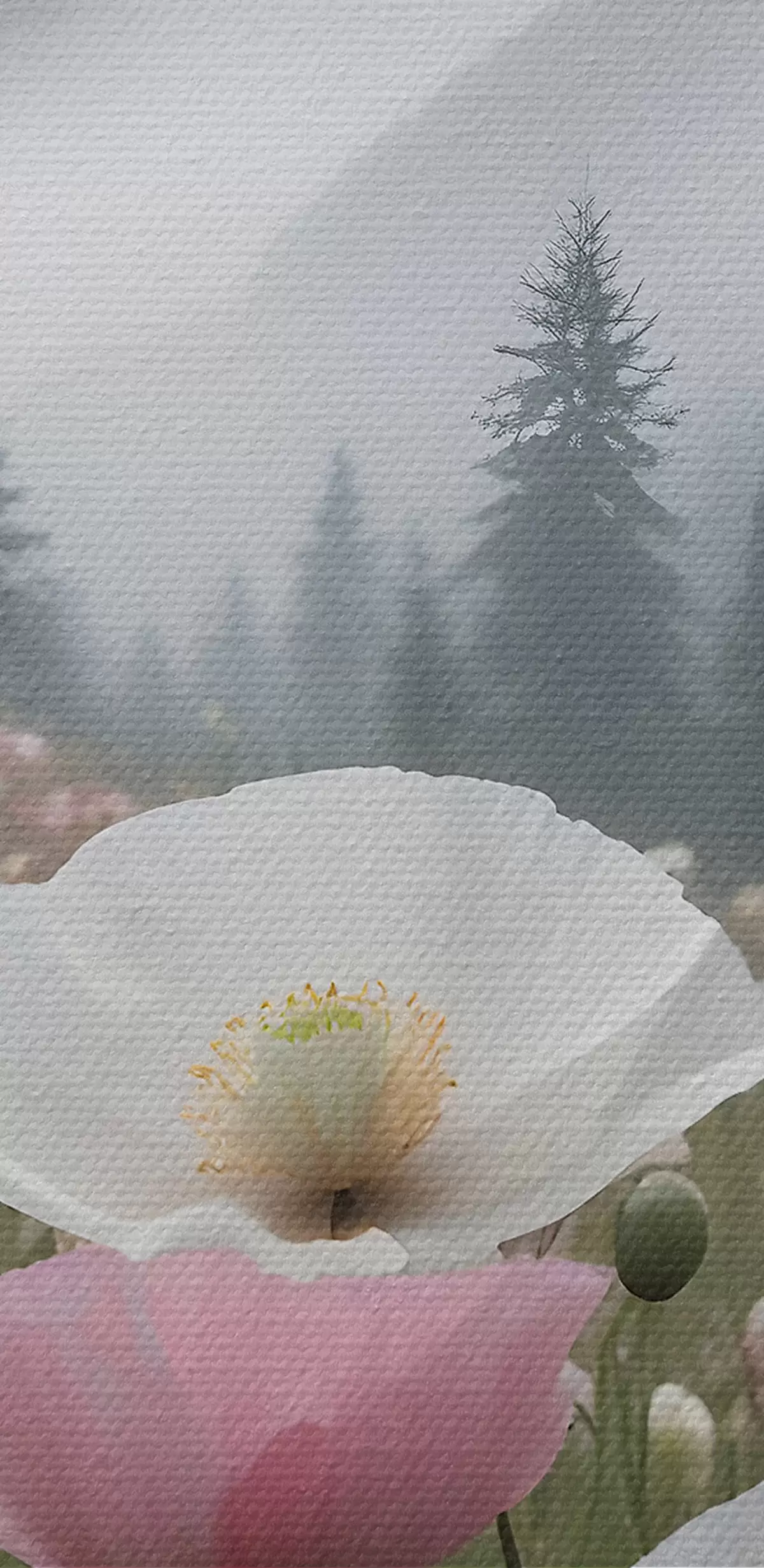 Wandbilder Ein Feld mit rosa und weißen Mohnblumen in der Berglandschaft im Hintergrund s38369