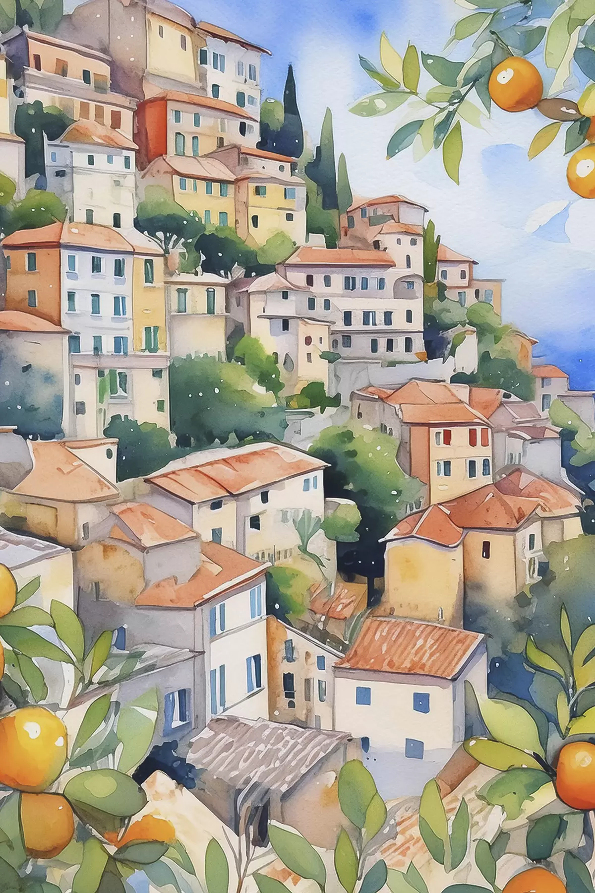 Wandbilder Mediterrane Architektur, Aquarell, Sommer, Orangen, Altstadt Art. s38396