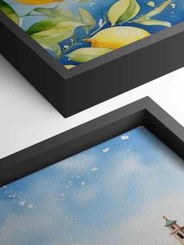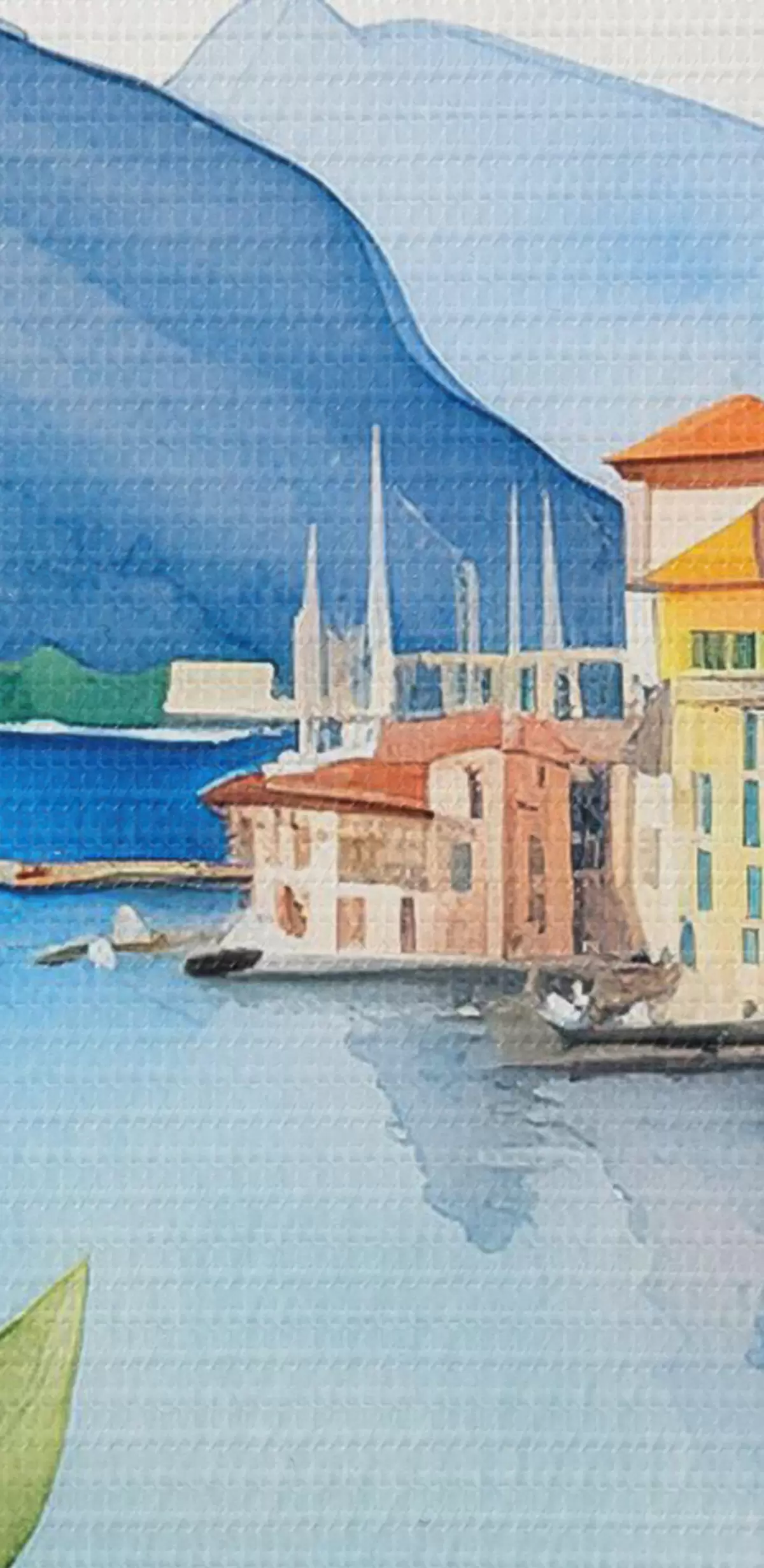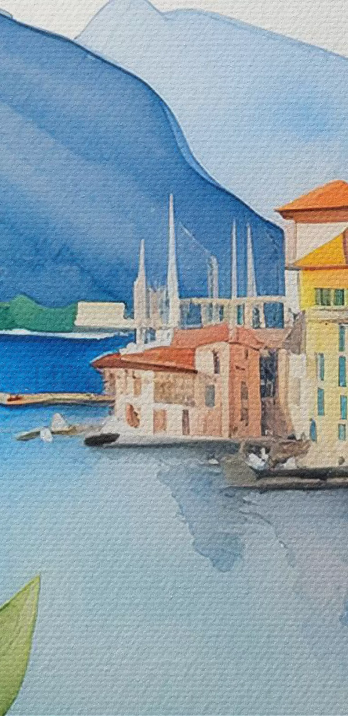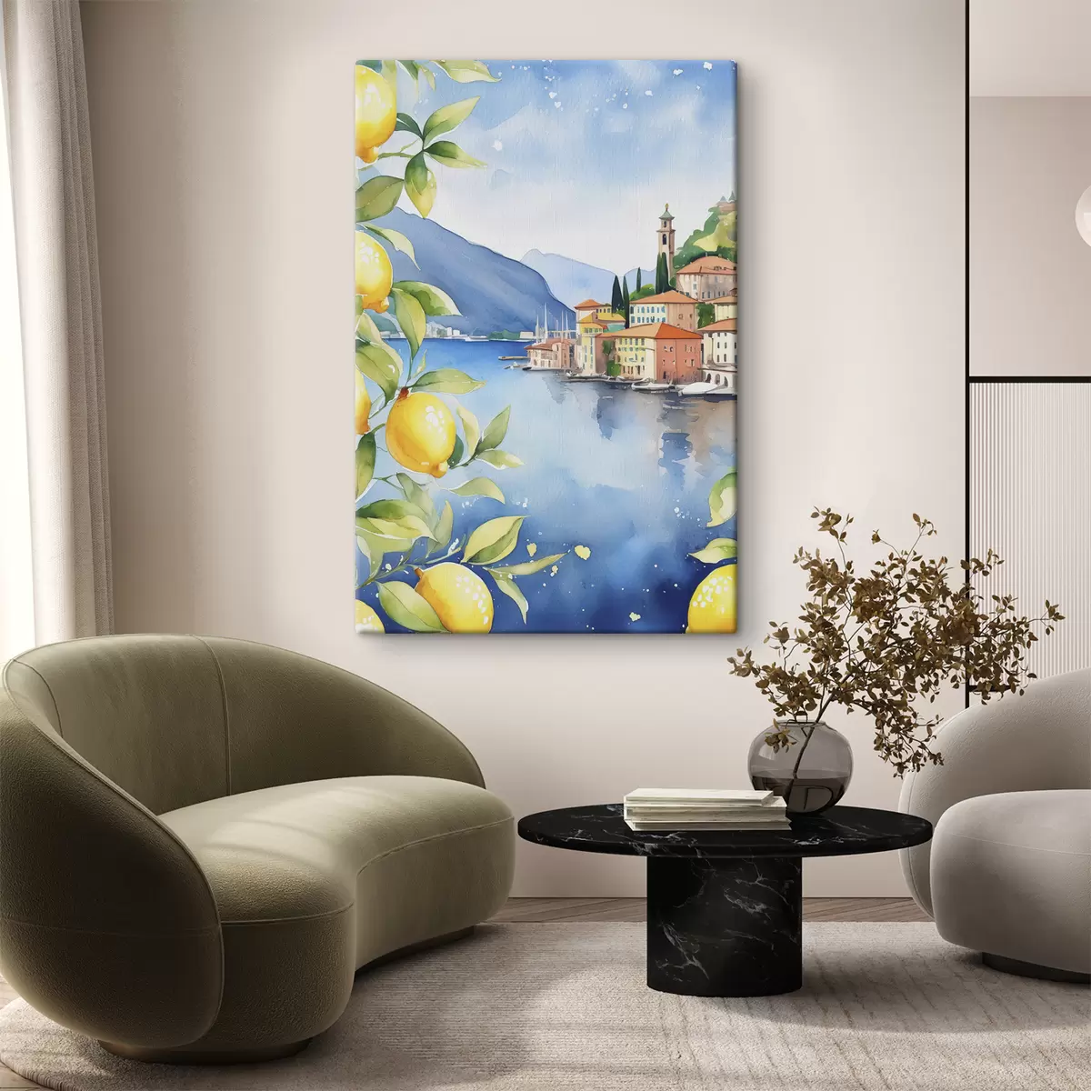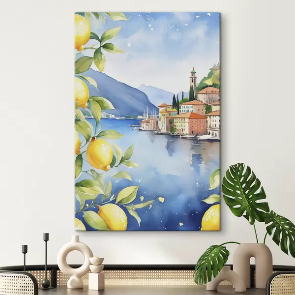 Wandbilder Italienischer See, Sommer, Aquarell, Naturlandschaft, Zitronen, Stadtarchitektur Art. s38397