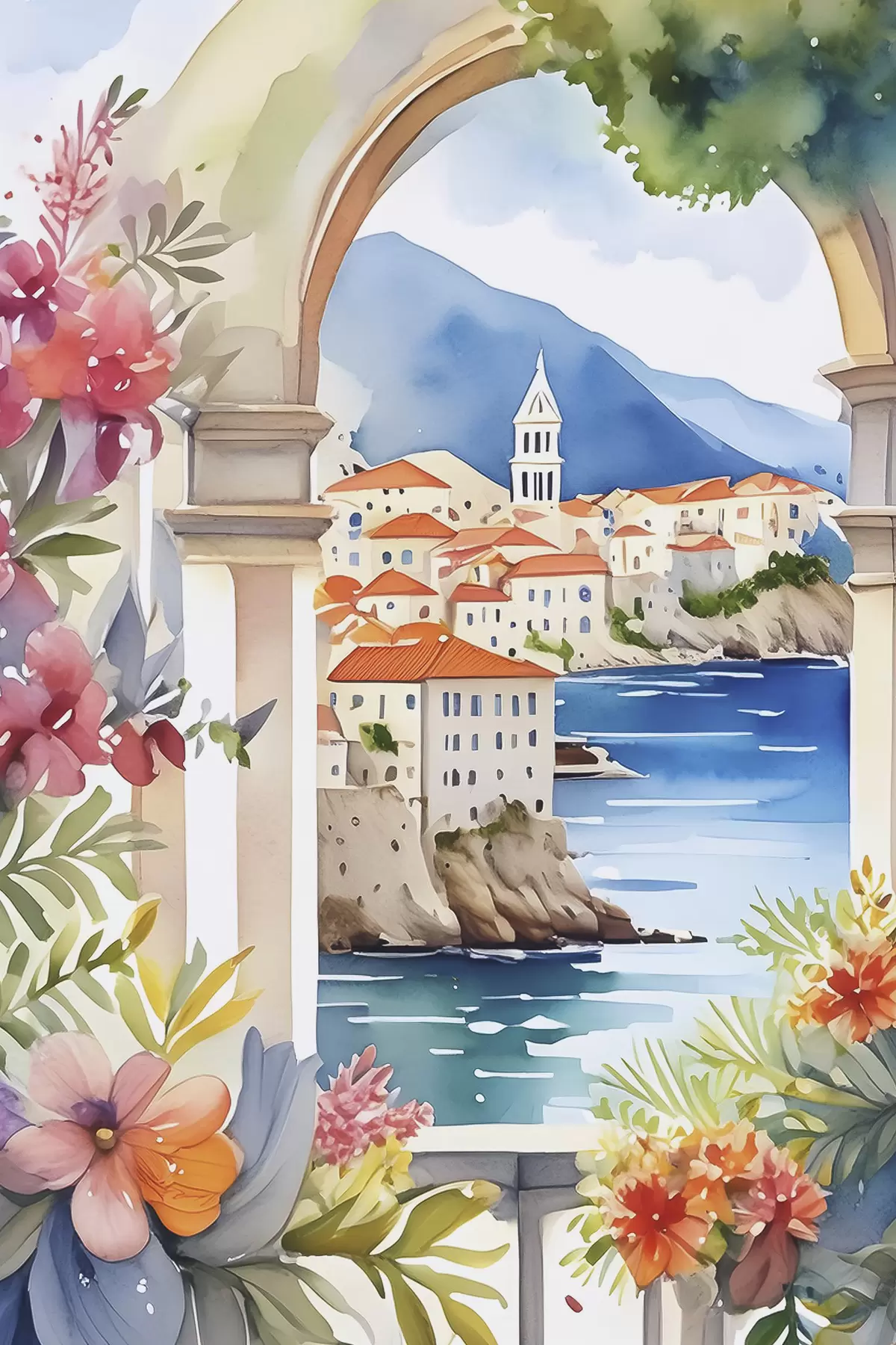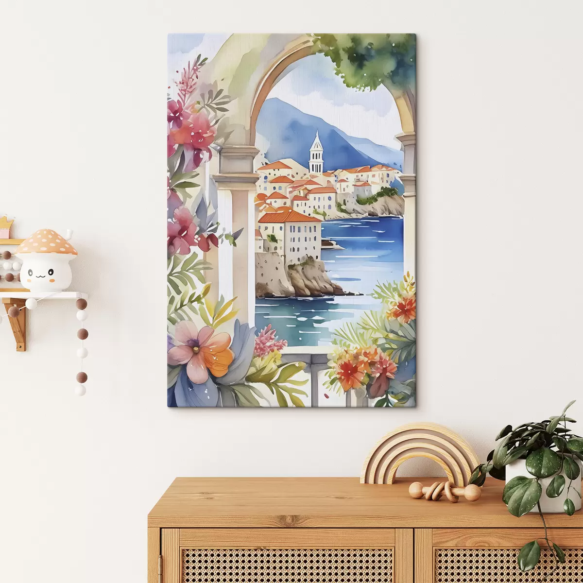 Wandbilder Mediterrane Architektur, Aquarell, Sommerblumen, blaues Meer, Berge s38408