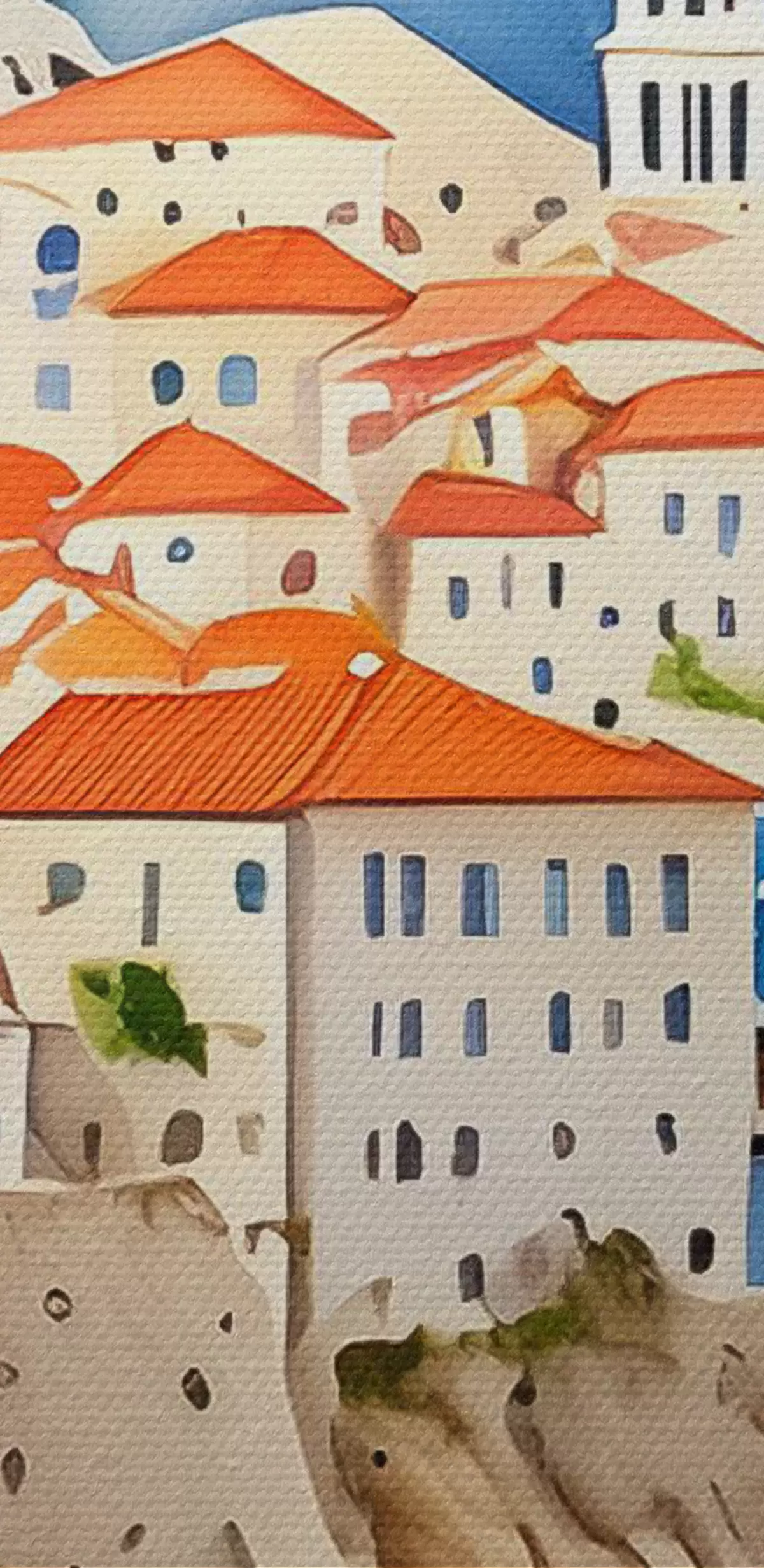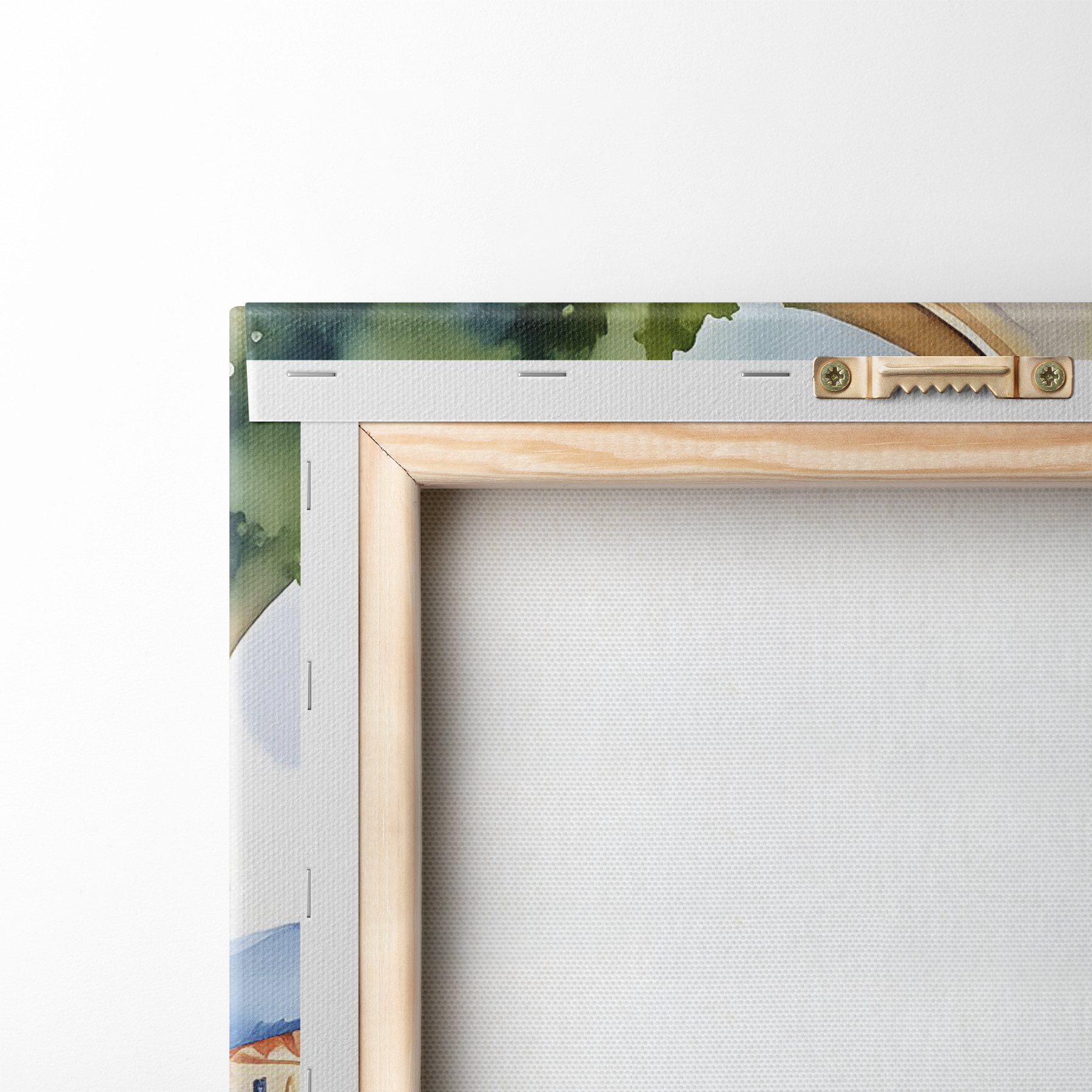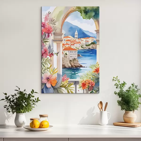 Wandbilder Mediterrane Architektur, Aquarell, Sommerblumen, blaues Meer, Berge Art. s38408