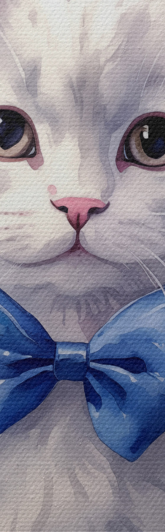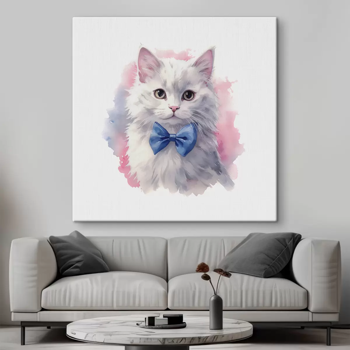 Wandbilder Weiße flauschige Katze mit einer blauen Schleife am Hals, Aquarell, Tier, grau, weiß, rosa, blaue Farbe Art. s38479