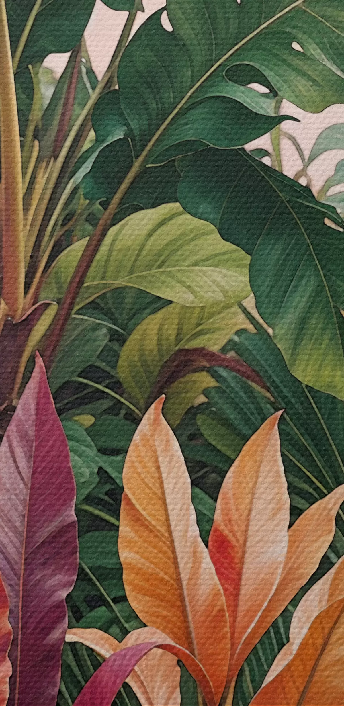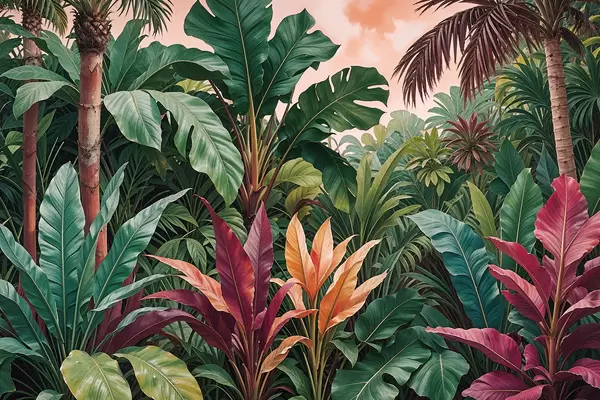 Wandbilder Ein üppiger, tropischer Dschungel mit leuchtend grünen Blättern, Palmwedeln und bunten Blumen s38817