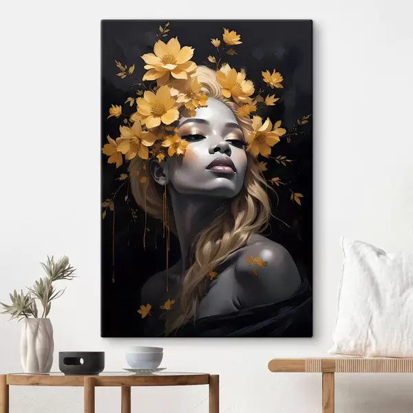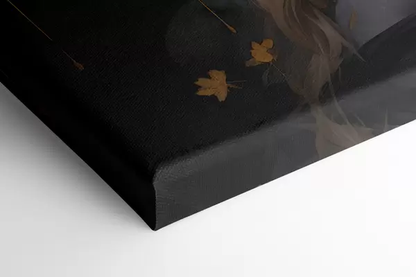 Wandbilder Ein Porträt einer jungen Frau, umgeben von gelb Herbstblättern vor einem dunklen Hintergrund Art. s38834