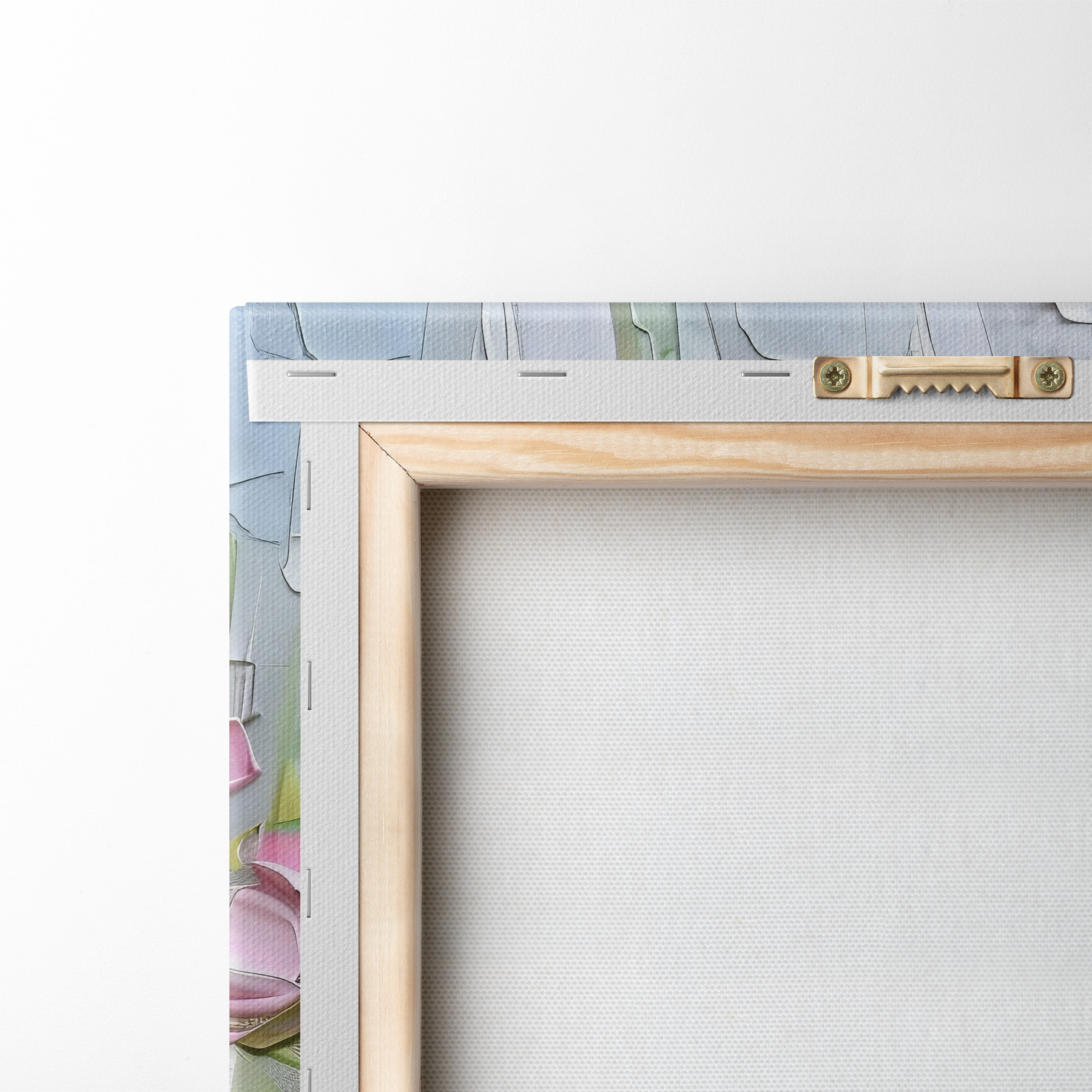 Um die Leinwand auf Keilrahmen zu spannen, ohne das Bild zu beschädigen, verwenden wir ein gespiegeltes Bild.